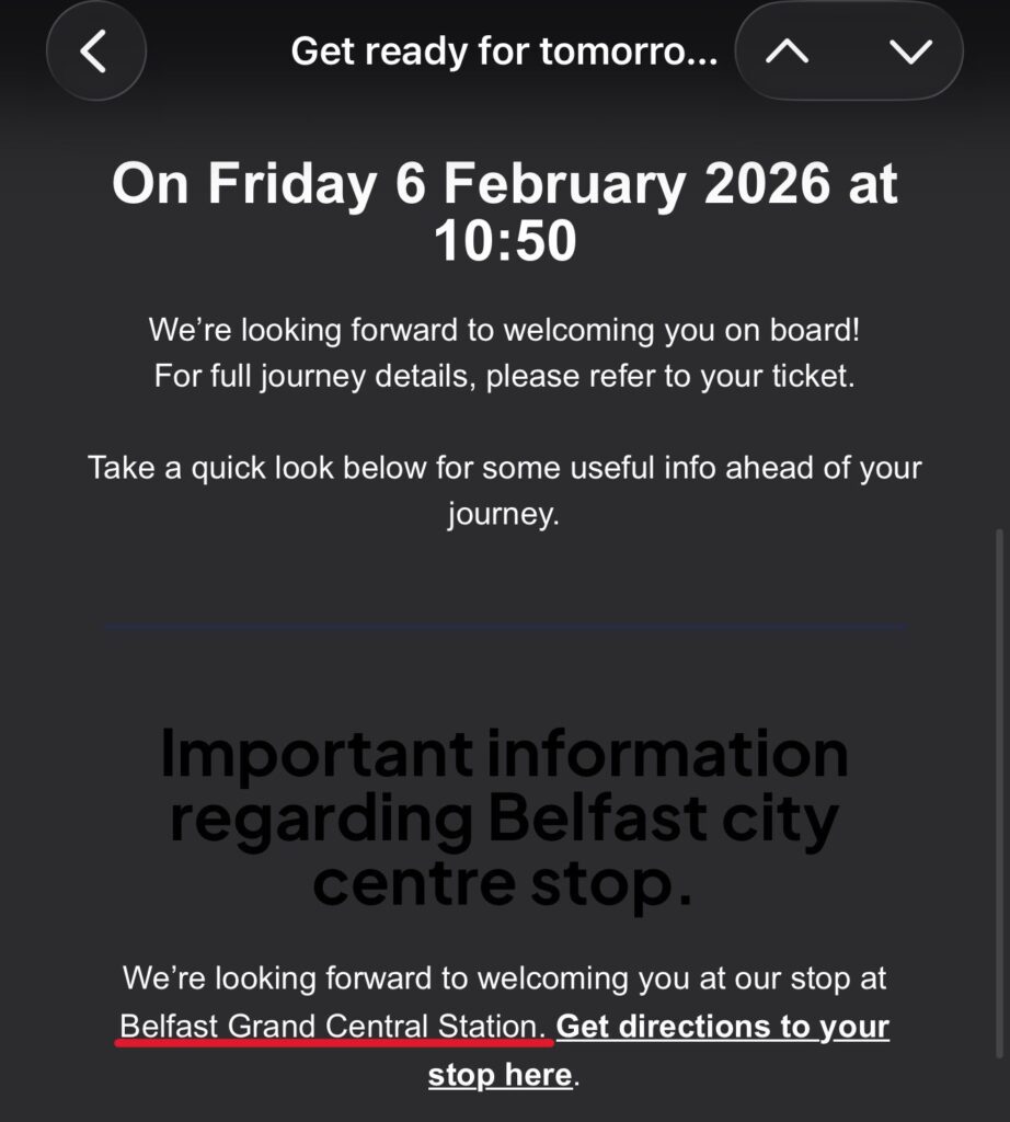 明日はバスでダブリンに移動する予定で、さっき予約確認メールが来ていたことを思い出し、出発時間と場所を確認。チケットは「Omio」(電車、バス、船の予約サイト)経由でnational express(バス運営会社)のバスを予約した。メールをチェックすると、その両者からほぼ同時に確認メールが届いおり、出発時間は両者とも「10:50」。でも、よく見ると「Omio」のチケットに記載された乗車場所は「Belfast, Upper Street / Wellington Street」。一方、「national express」の乗車場所は「Belfast, Grand Central Station」