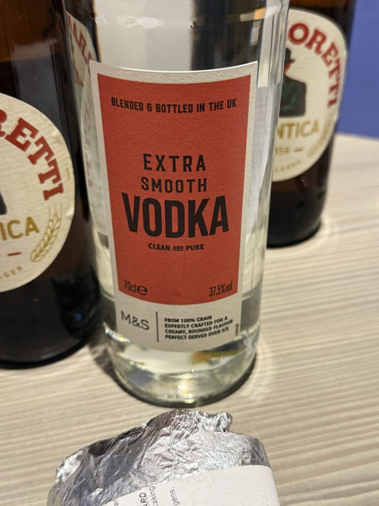 次に、何はなくても酒だ。僕は健康数値の関係でビールやワインより蒸留酒の方が好ましく、日本からは「下町のナポレオン いいちこ」を持参したのだが(毎度持ってくる)、今回はロンドンのホテルに置いてきた。そこで飲みたいのが、マークス&スペンサー(M&S)のウォッカ(£14.50)。”Extra Smooth”のキャッチフレーズの通り、癖がなく飲みやすい。この酒を確保してアイルランドで飲む酒は一安心。