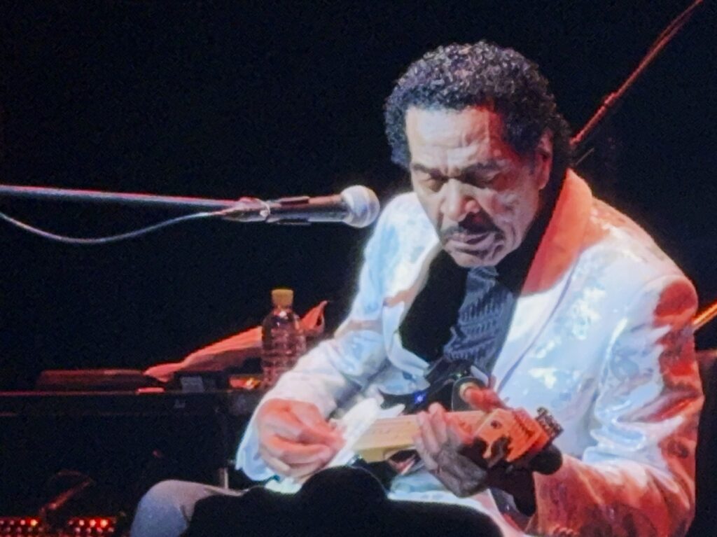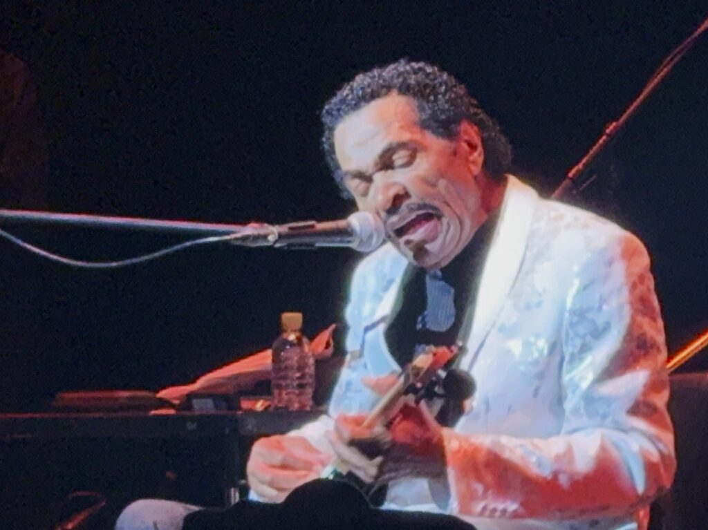 椅子に座ったのは、スムーズに弾き語りに入るためだったのだ。バンドメンバーは袖にはけることなくボビーを静かに見守っており、この弾き語りパートは予定外だったのでは?期せずして、本物のブルースを聴けて最高だ!