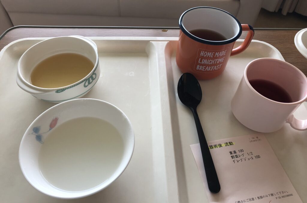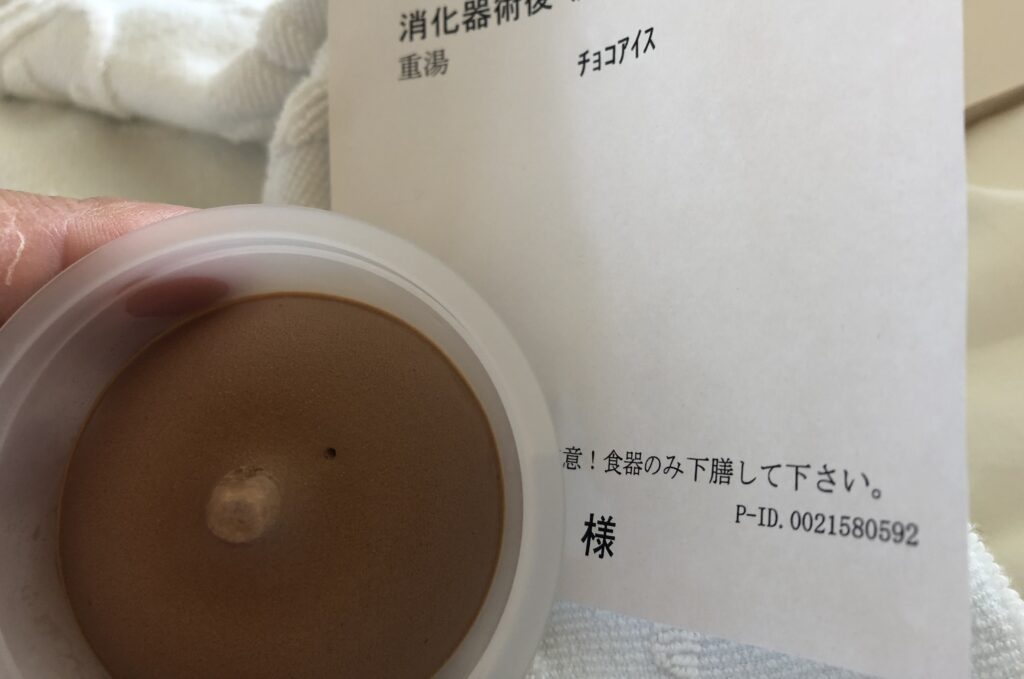 術後3日目まで摂取できるのは水か麦茶のみ。それが4日目の昼食で初めて流動食になり、重湯、野菜スープとグレープジュースが供された。手術前日から数えて5日間は断食状態だったので、薄味だったけど身体全体に染み渡る美味しさだった。15時のおやつには、なんとチョコアイスが出た!お腹を冷やすアイスなんて食べていいの?と思いながら貪るように食べた。