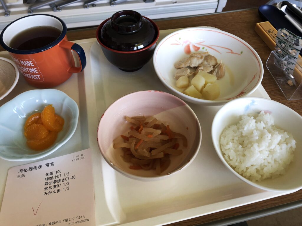 その後も日を追うごとに食事が固形になっていった。「軟食」を経て術後10日目には「常食」になり、その翌日(6月初旬)には退院することができた。