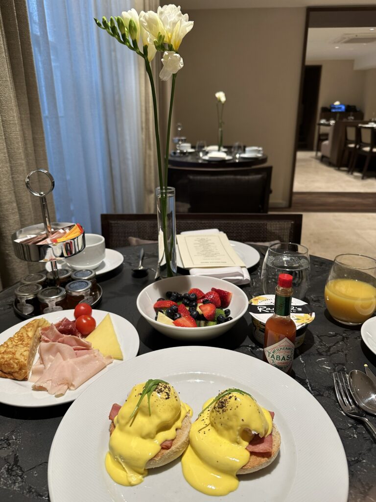 朝食はエッグ・ベネディクト。タバスコを振りかけると、オランデーズソースがあっさり味に(以前、レストランのスタッフが教えてくれた)。