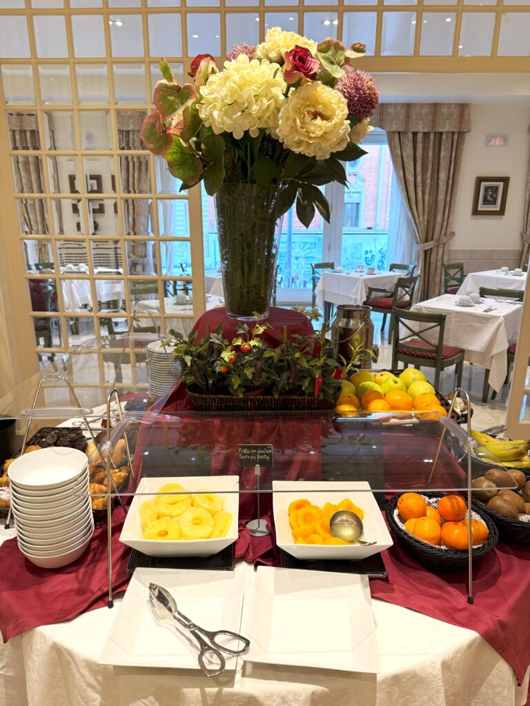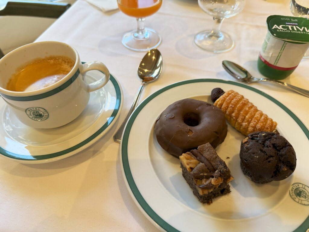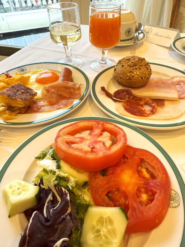 そしてなんといっても、スパークリングワイン!これまで様々なホテルに宿泊してきたが、朝食時にお酒を出すホテルははじめて。おかげでイベリコハムを美味しく食べることができた(スペイン、いい!)。サラダをたっぷり食べて、オレンジジュースをたくさん飲み、チョコレート系デザートをたらふく食べてお腹を一杯に(これで1日分の食事)。