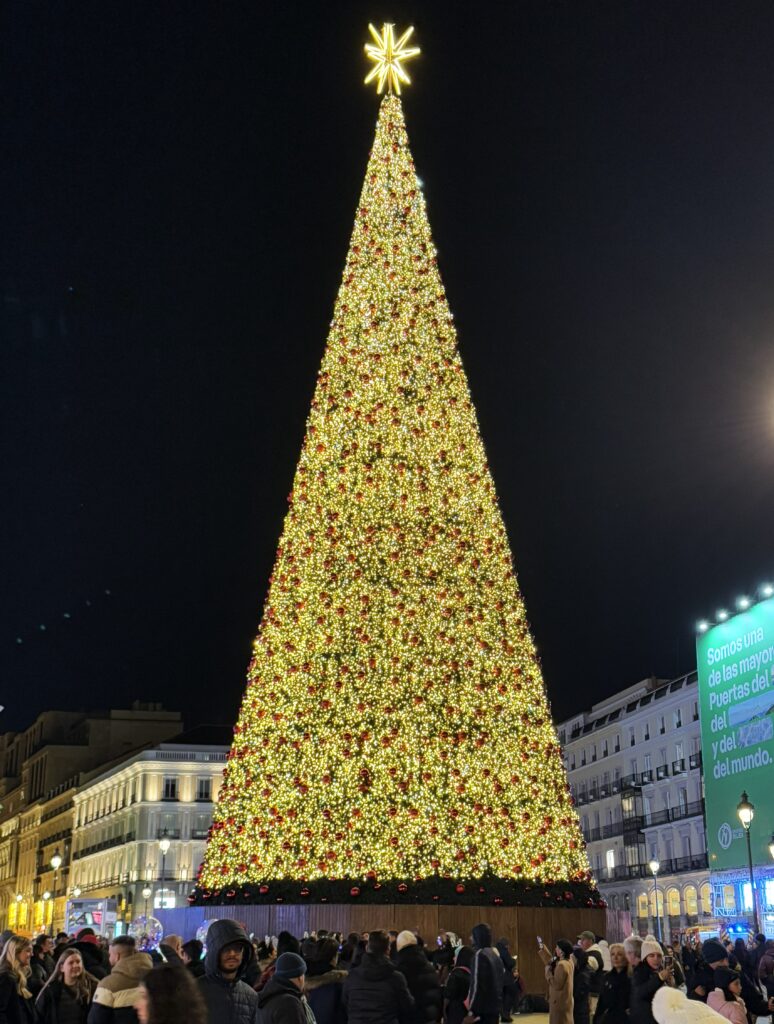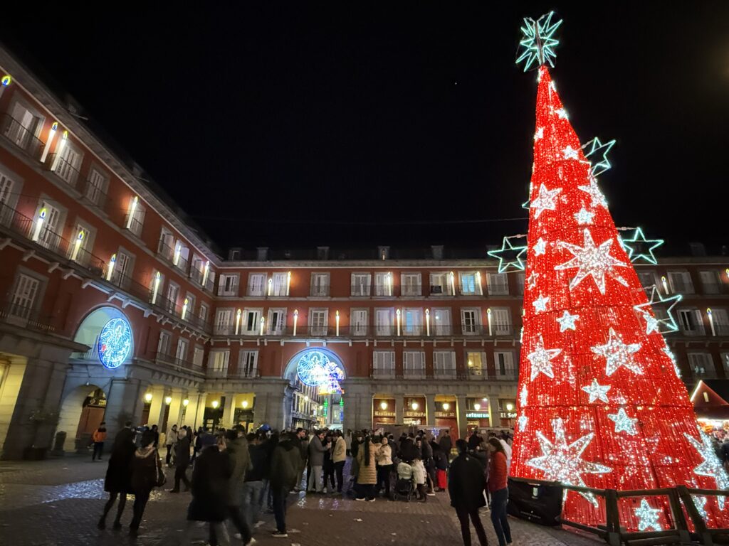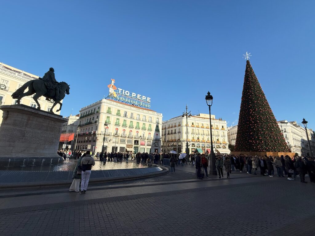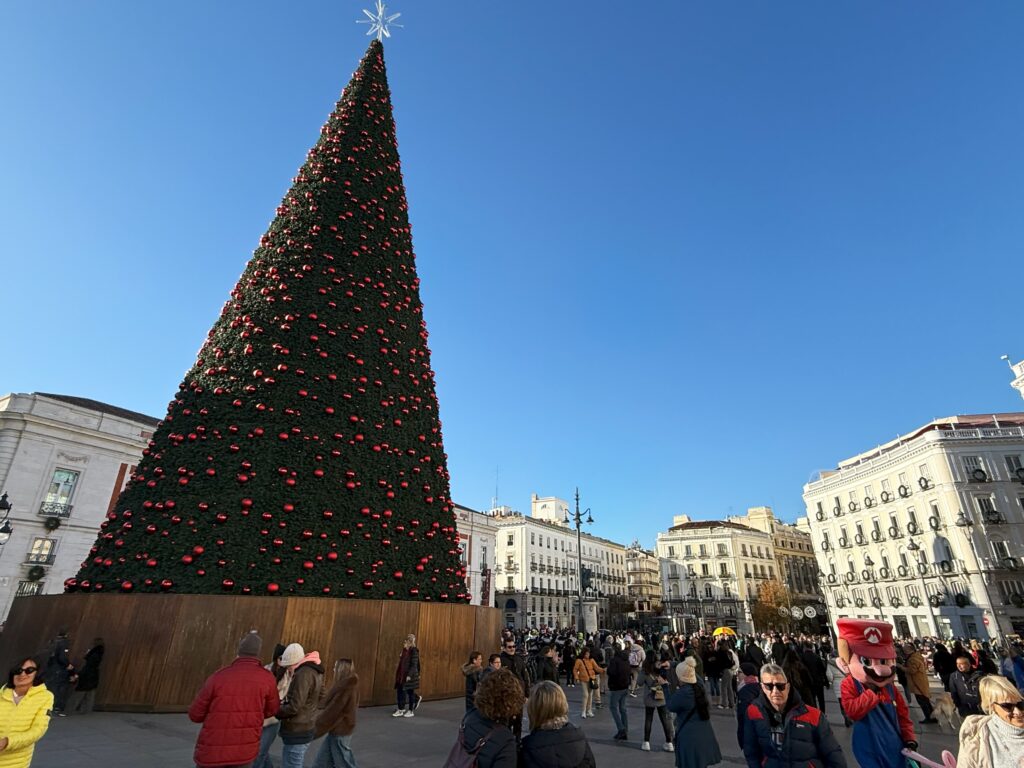 プエルタ・デル・ソル広場は、巨大ツリーですっかりクリスマス気分。女声コーラス隊がマライヤ・キャリーの「 All I Want for Christmas Is You」を練習している。