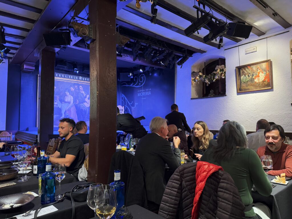 ここはマドリード随一の老舗タブラオ(食事をしながらフラメンコを楽しむレストラン)。食事なしの席を予約したので、ステージから遠く、柱が視界を遮る席に通された(食事ありで予約すると、ステージ近くの席をあてがわれる可能性が高い)。客席は地元常連客と観光客が半々くらい。