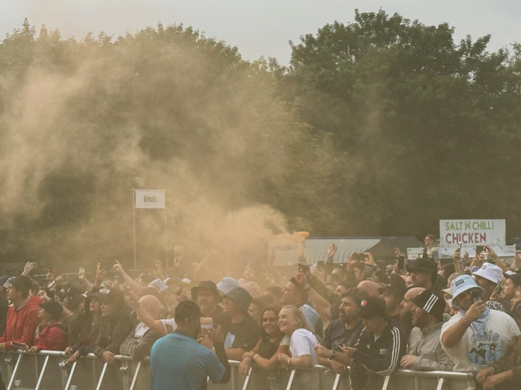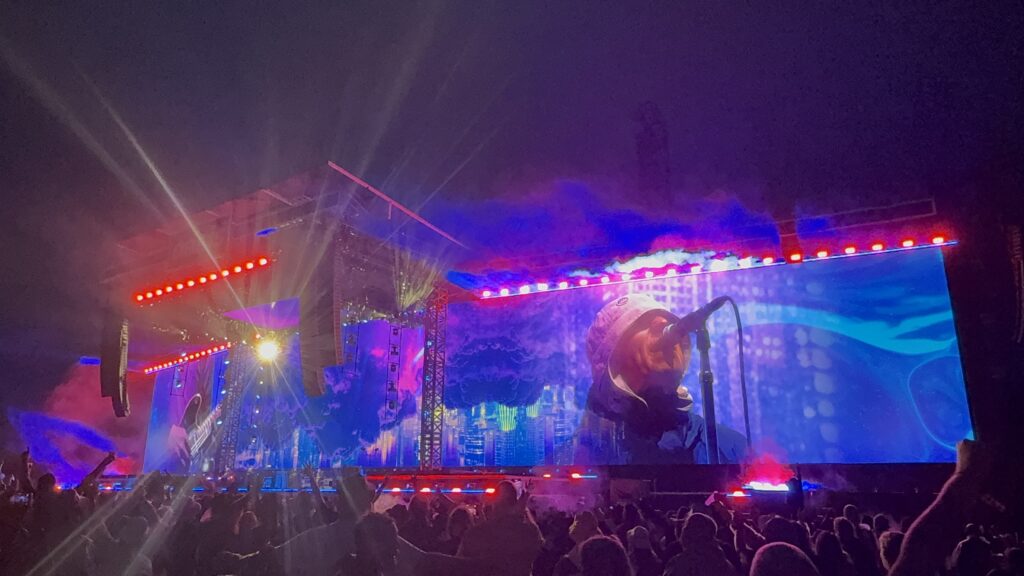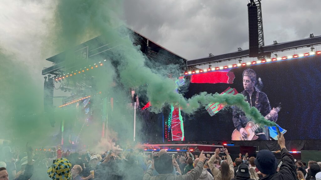 オアシスが登場する頃には雨雲が戻ってきてしまったが、会場内では大量のスモークが焚かれ盛り上がりを見せる。