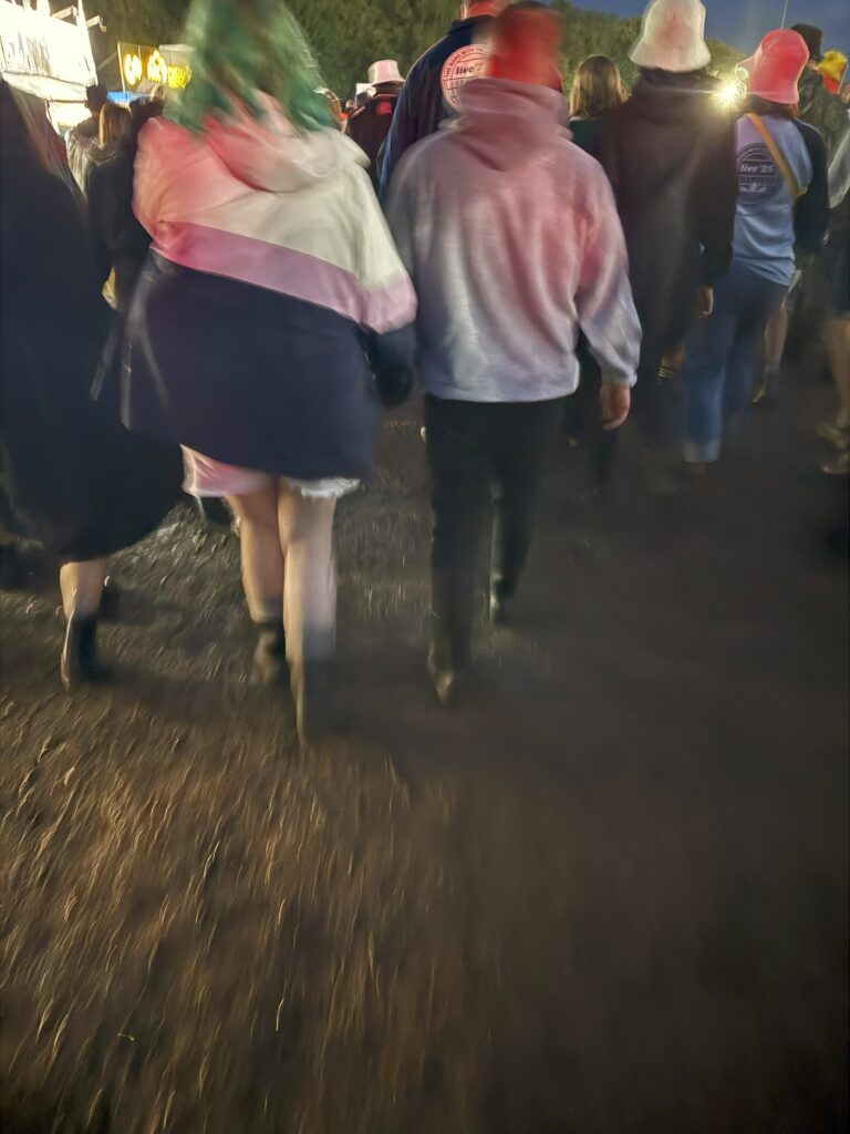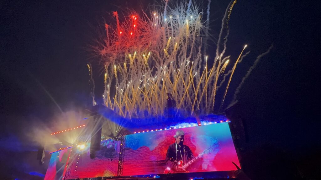 しかし、雨でもいいことがあった!晴れると終演前後まで明るいのに、今夜は早く空が暗くなったので、「Champagne Supernova」でライティングがフルに効果を発揮。なんて美しい光景だろう。