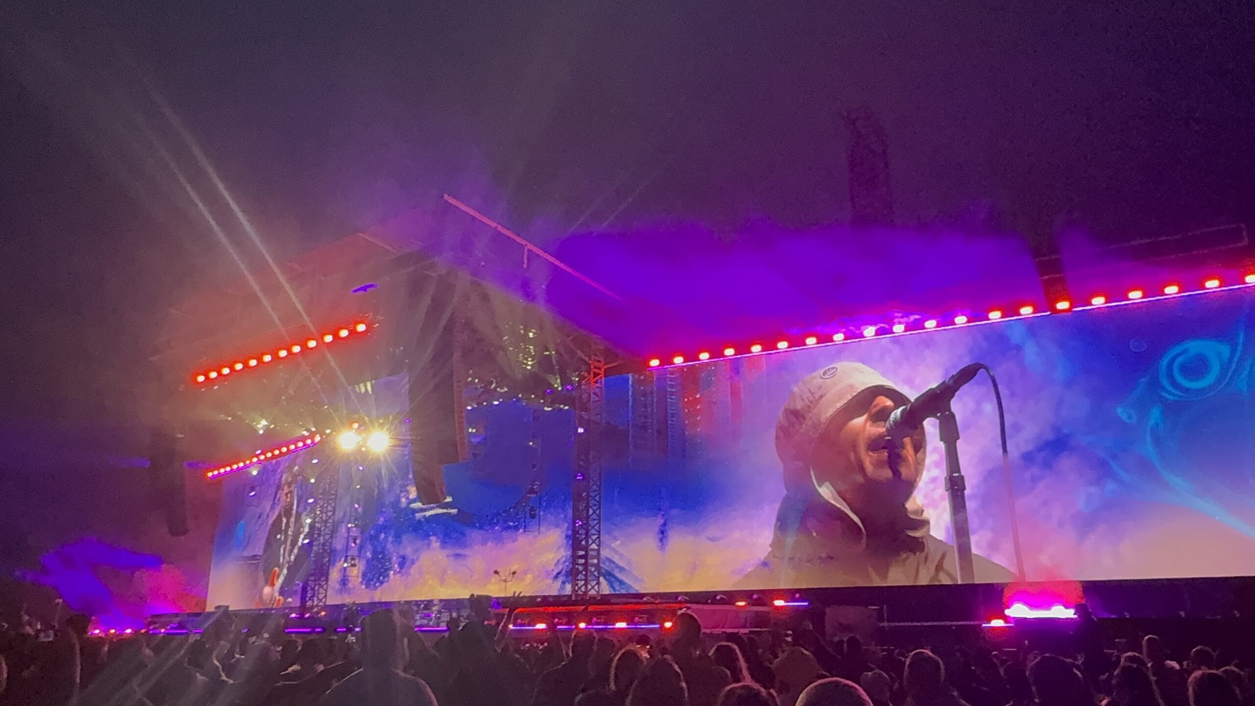 しかし、雨でもいいことがあった!晴れると終演前後まで明るいのに、今夜は早く空が暗くなったので、「Champagne Supernova」でライティングがフルに効果を発揮。なんて美しい光景だろう。