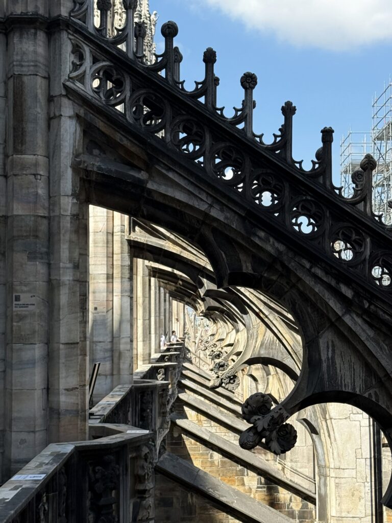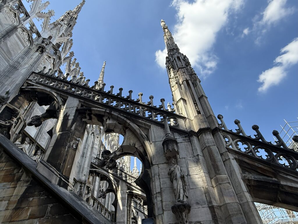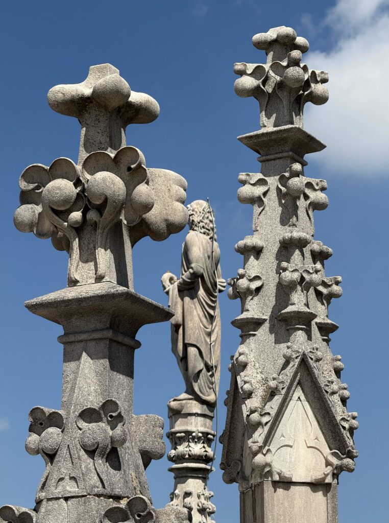 最初にエレベーターで屋上に向かう(要予約)。屋上に出ると、無数の尖塔や彫刻像、幾重にも精密に重なる建物のパーツ、見たことのないゴシックな世界が広がる。