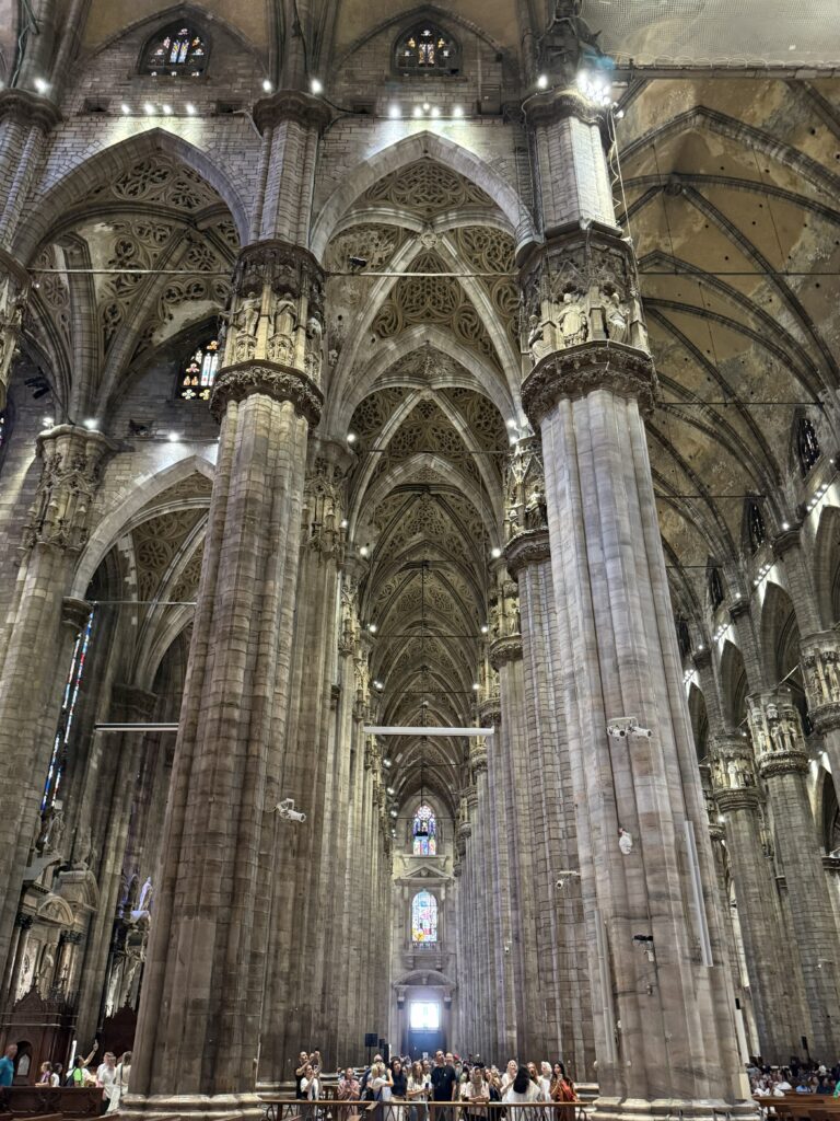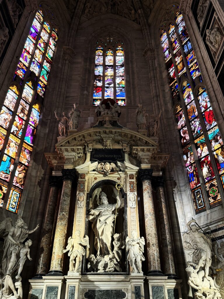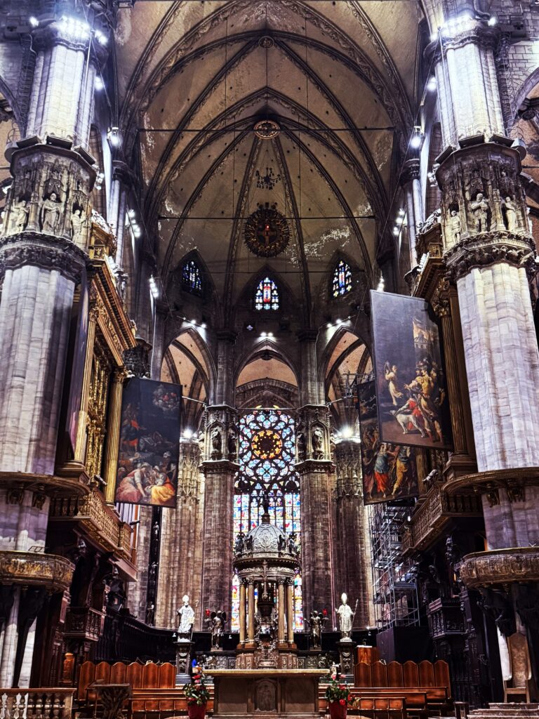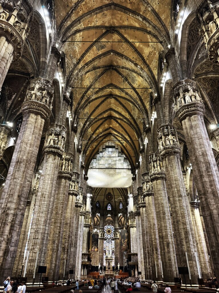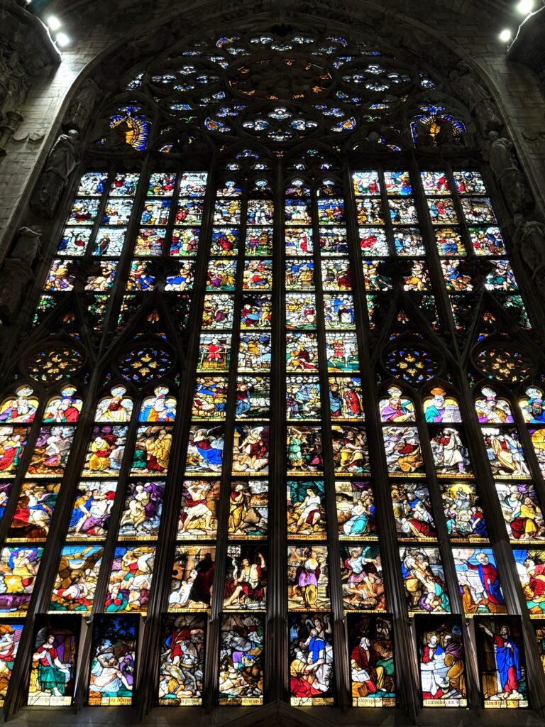 階段を降りてドゥオーモ内部に入る。ゴシック建築特有の高い天井と大きなステンドグラスが圧巻だ。これぞ、ザ・ゴシック。