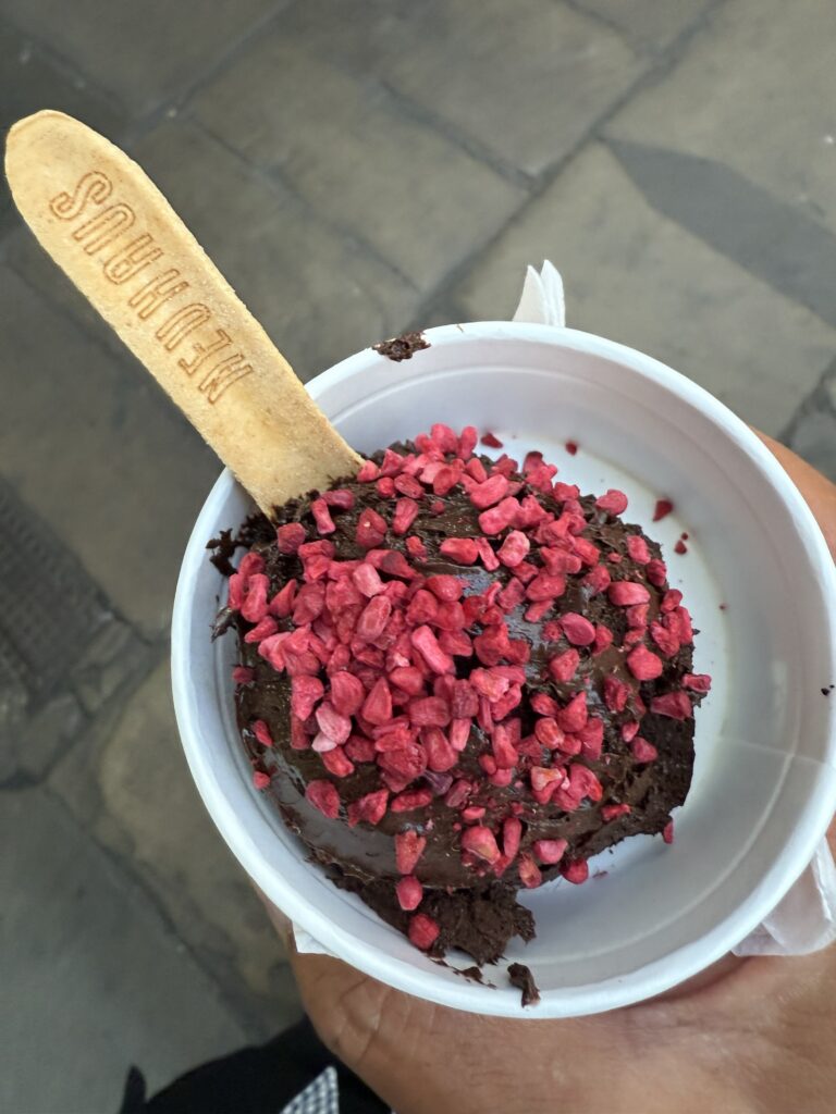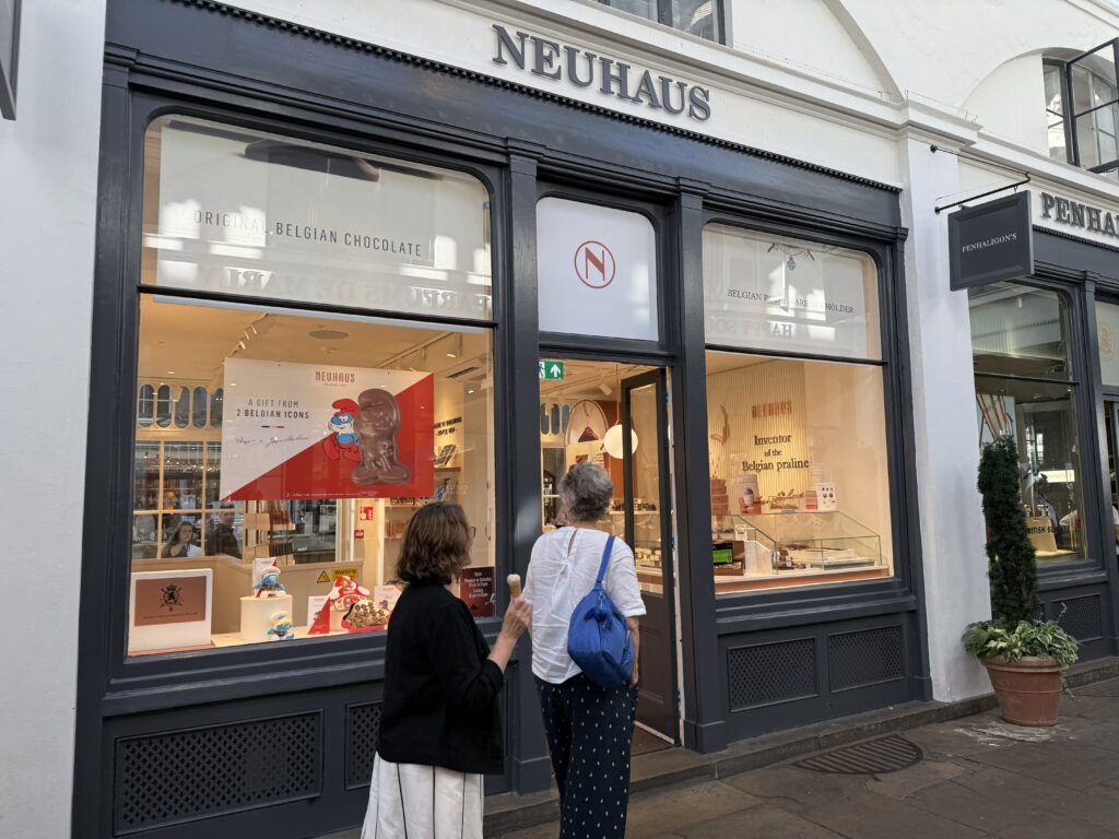 親戚のお土産を買うためにコヴェント・ガーデンに移動して、ベルギーチョコレートの「ノイハウス(NEUHAUS)」へ。ロンドン土産がベルギーチョコというのも変だが、「ノイハウス」のチョコは日本では入手ができないので(通販サイトはあるが、ほぼ品切れ中)、常設店舗のあるロンドンに来る度に土産を買うために訪店するようになった。レジを済ませると、顔馴染みのスタッフが「あら、あなた、また来てくれたの?それじゃぁ、これをあげるわ」と、おまけにチョコレートムースをくれた。ガッツリ甘いチョコレートに酸味の効いたラズベリーのトッピングが美味しい。
