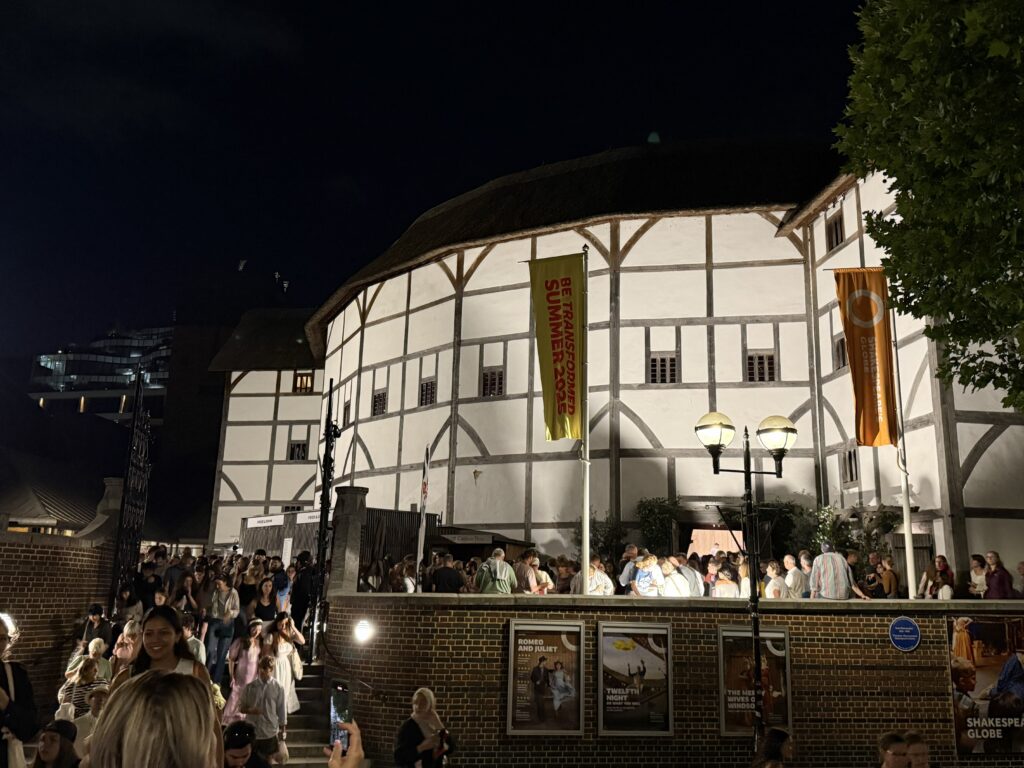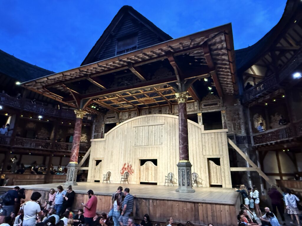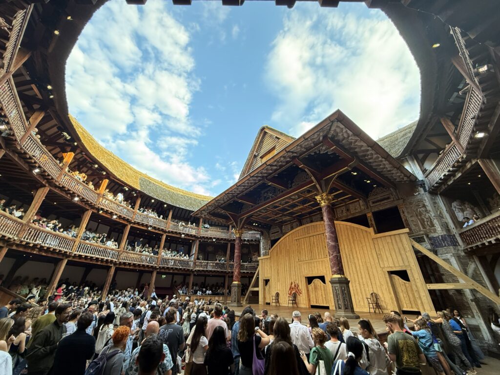 今夜はシェイクスピアズ・グローブで「Romeo and Juliet」。シェイクスピアが活動した400年前のビクトリア朝時代の劇場を再現し、平土間の立ち見エリアと茅葺き屋根が雰囲気を醸す。現代的な演出を付けた演技にはなっているが、この広い屋外劇場で俳優たちはマイクを使わずに声を張って演じる。相当な負担だろう。実際、ロミオ役の俳優は開演時から声がかすれていた。観客にとっても休憩含めて3時間を超える上演時間を背もたれのない木製ベンチに座って観劇するのは、なかなか大変だ。隣に座っていた大柄な観客(クッションなし)は、二幕目が始まっても自席に戻ってこなかった。お尻がもげ取れそうになるので、行く人にはクッション付きチケットの購入をお勧めする。時々上空を横切るジェット機とスマホの着信音を除けば、400年前の空気に浸ることができる。