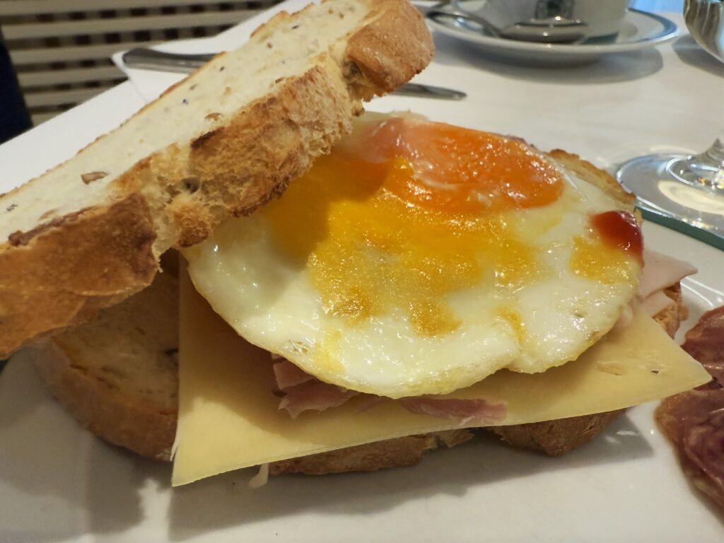 トースターでパンを焼き、ハムチーズタマゴサンドを自作。美味い。