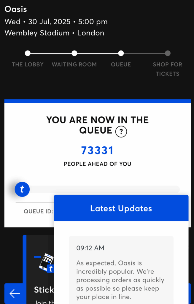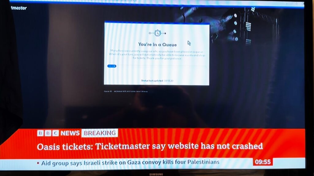 今日のチケットは、昨年8月31日のチケット発売日に唯一取ることができたものだ(それ以外のチケットはすべてチケットマスターのリセール)。チケット発売当日はたまたまロンドンにいて、朝10時のチケット発売に備えて8時40分からスマホ3台をチケットマスターのサイトにアクセスして待機。9時に自動的に待ち行列(Queue)の画面に変わり、9時20分に「自分の前に何人待っているか」が表示された。スマホ3台のうち、一番若い番号は7万3千番台。ウェンブリー・スタジアムのキャパシティは8万人と分かっていたので、朝から絶望的な気持ちになった。BBCニュースもリアルタイムで「チケットマスターのサイトに繋がらない問題が生じている」と報じ、ニュースキャスターも「全然繋がらない」と自分のスマホ画面を視聴者に見せた(あのー、仕事中ですよ・・・)。チケットマスターは「サーバーはダウンしていない」とコメントを繰り返す。結局、チケット発売時刻の10時から5時間弱が過ぎた14時40分、やっと今日のチケットを購入することができた。
