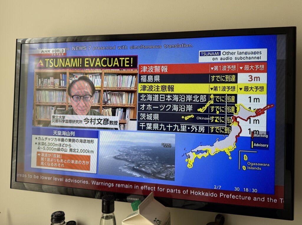 カムチャツカ半島周辺でマグニチュード8.7の地震が発生し、日本の太平洋沿岸の広範囲に対して津波警報が発令された。NHK WORLDはずっと地震と津波のニュースを報じ続けている。