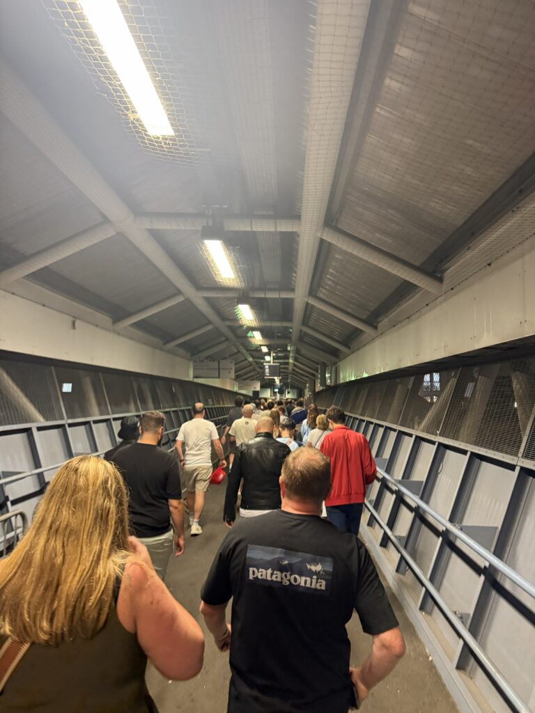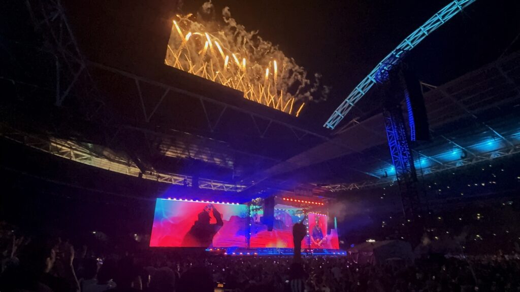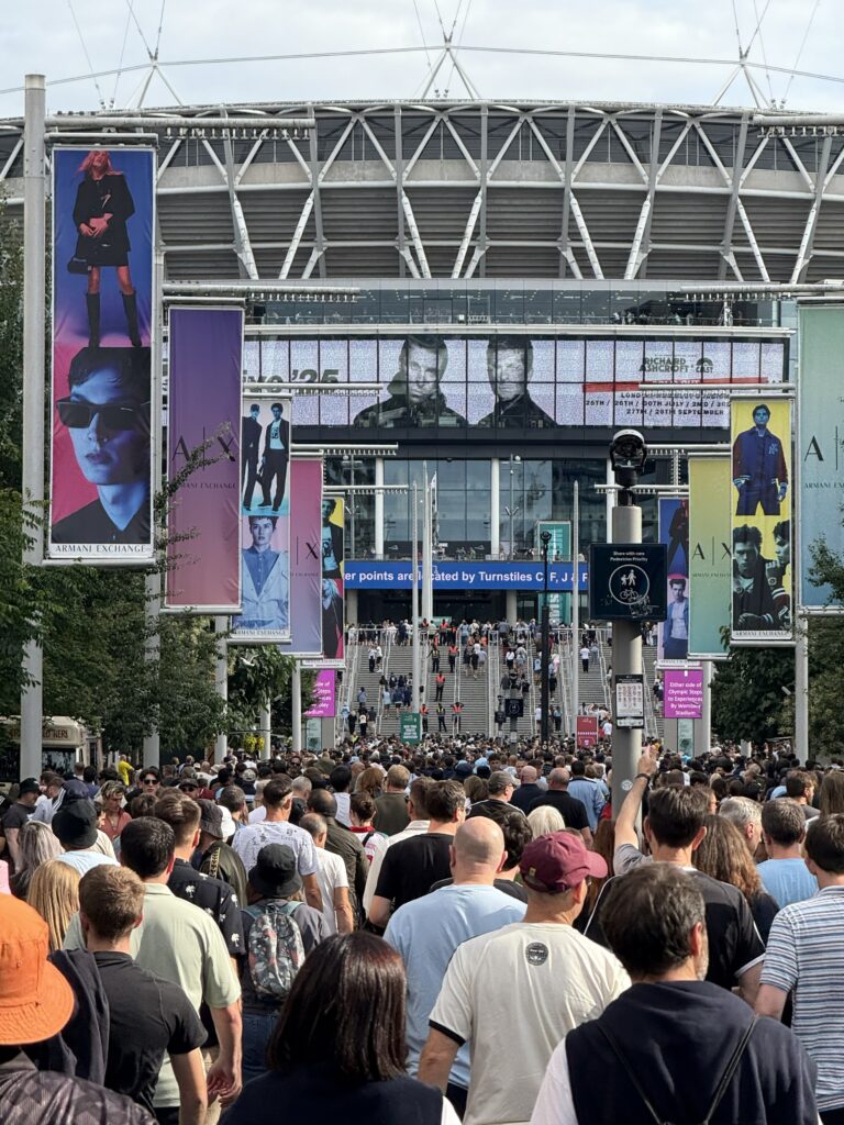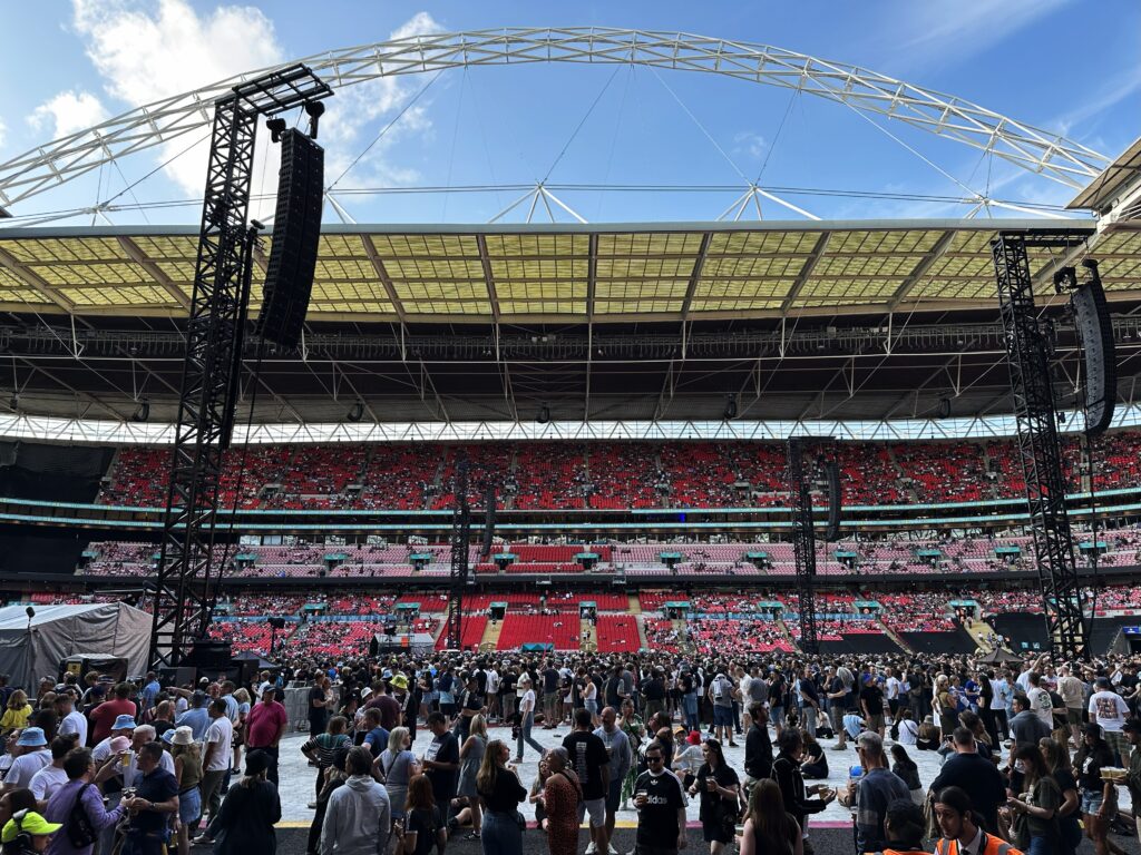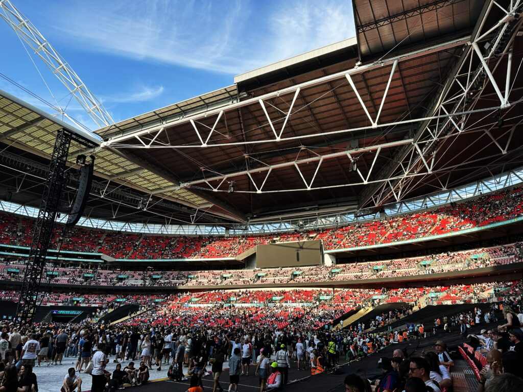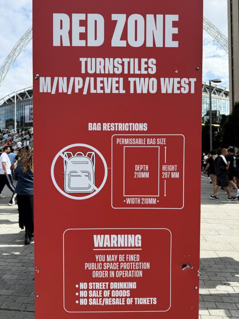 地下鉄でウェンブリー・スタジアムへ。会場内へはA4サイズまでの荷物しか持ち込めず(ヨーロッパの大きなライブ会場では一般的)、大きな看板で注意表示されている。今日はゲートに着くまでにスタッフから2回も持参したバッグの大きさについて声をかけられた(「A4」サイズまでしか持ち込めないけど大丈夫?)。僕のバッグはちょうどA4サイズで、これまでヨーロッパのライブ会場で持ち込めなかったことはなかったので、「大丈夫だよ」と答えたら、「グッドラック」と返された。今日は指定席で、入場時のチェックに時間がかかっても問題がないのでバッグを持参したが、没収されると面倒なので次回からは手ぶらで来よう。結果、バッグは問題なく持ち込めた。