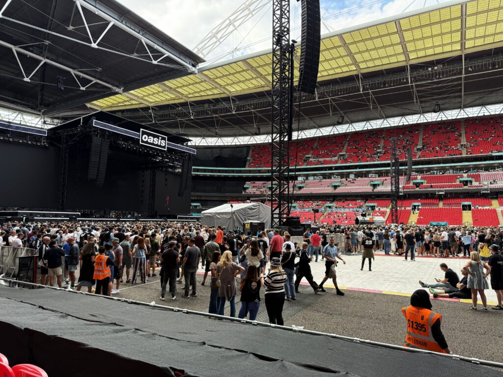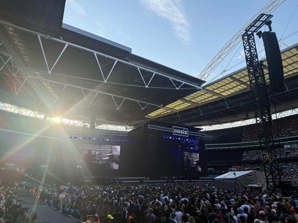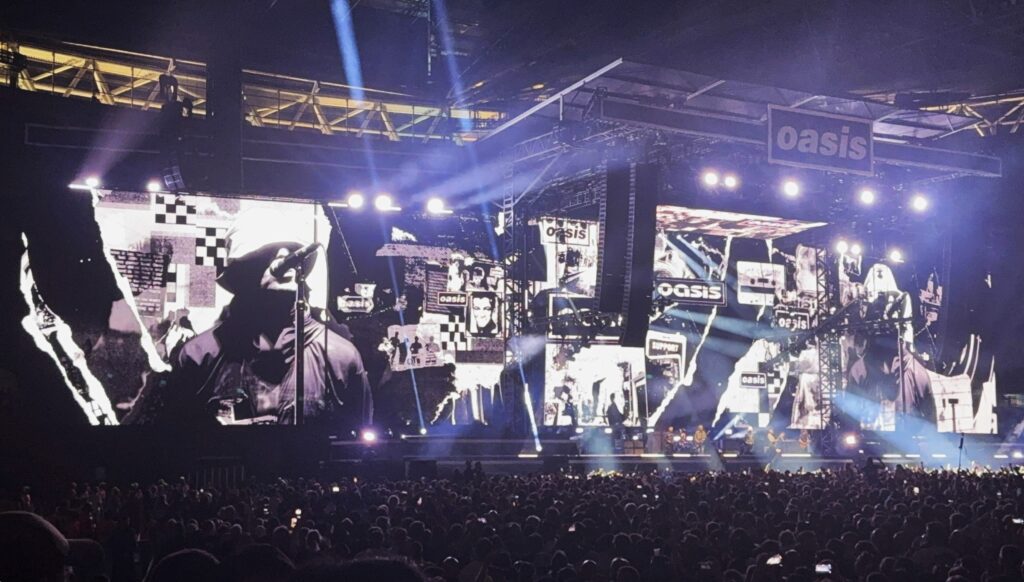 初めてウェンブリーのスタンドから観たオアシスのライブは壮観だった。スタジアムをパンパンに膨れ上らせた観客が飛んだり跳ねたりしているのを見ると、オアシスがどれ程愛されているのか、よく分かった気がした。数多くのライブを観てきたが、こんなに観客が熱狂的で一体感のあるライブは初めてだ。大合唱する聴衆の群れを見ていると、オアシスの一曲一曲が観客一人一人に深く沁み込んでいるのがよく分かる。