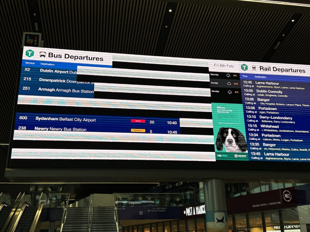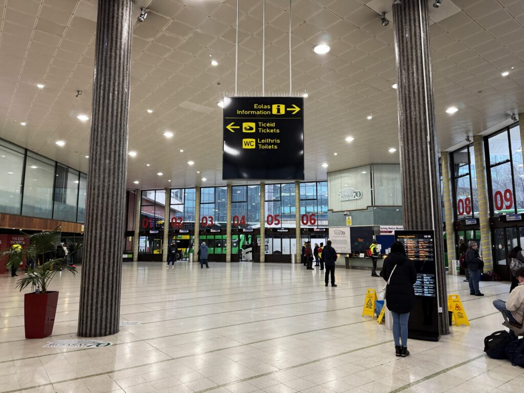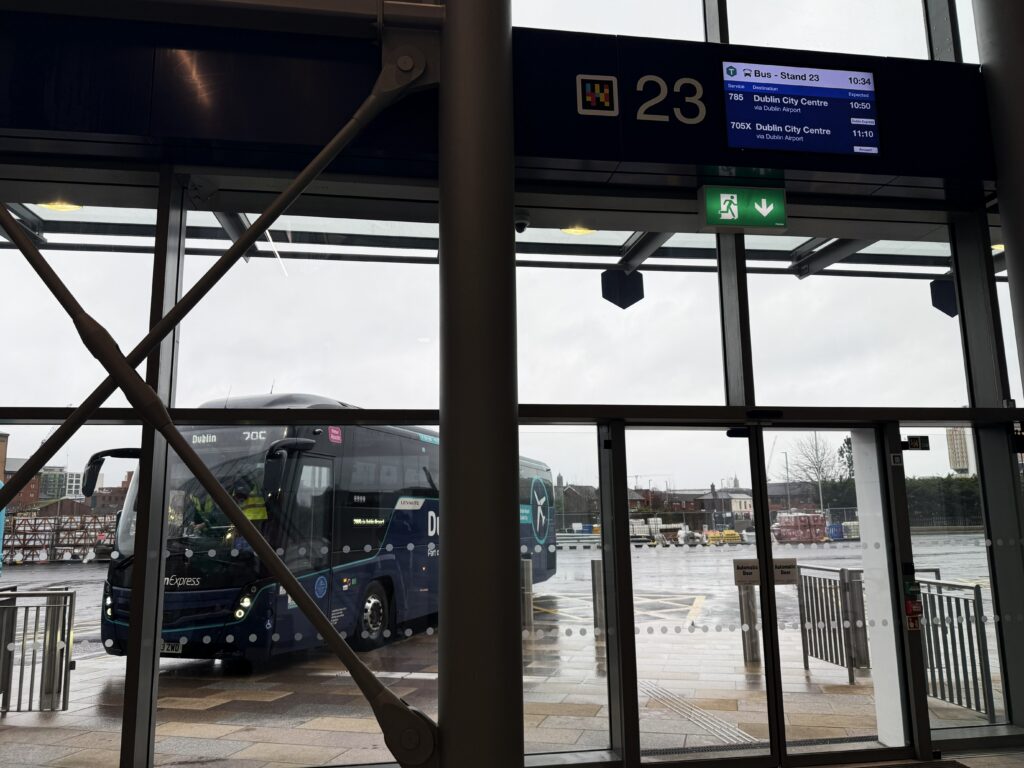 スタッフが見当たらないので、26あるバス停を1番から順に行き先を確認していく。結局、僕が乗車するダブリン行きの「X1785」のバス停は23番だった・・・。トホホ。駅に早く来てよかった。