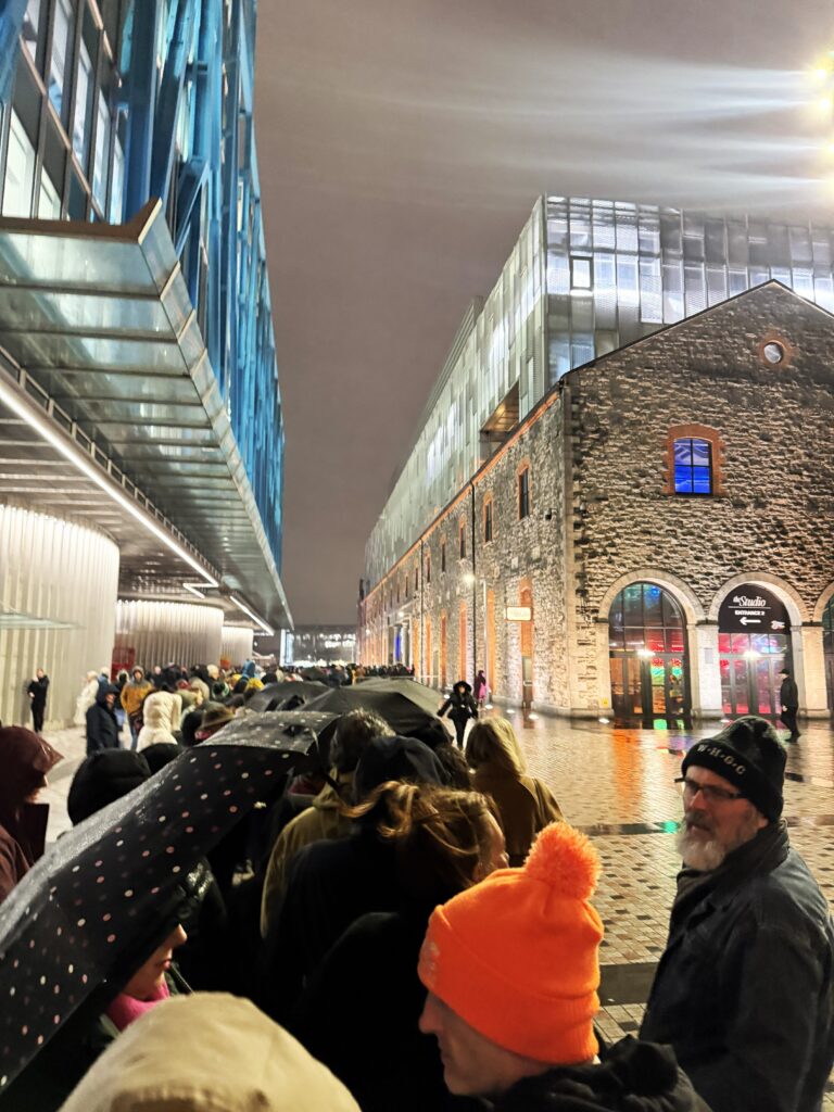 道中、ベルファストのライブ会場でも会ったブライアン(日本在住のアイルランド人)から「ダブリンの3アリーナに着いた。今どこ?」とラインがくる。今夜のライブ会場は、「アリーナは先着順のスタンディング」、「スタンドは指定席」だ。長時間のライブになりそうだったので僕は2階スタンドの指定席を取ったが、ブライアンはアリーナ最前列でヴァンを観るつもりだという。まだ12時半なので開場まではあと6時間半もある。「指定席を取って、今ダブリンに向かっている」と返すと、「多分、それは賢い判断だよ」との反応。冷たい雨の中、何時間も並ぶ根性には恐れ入った。