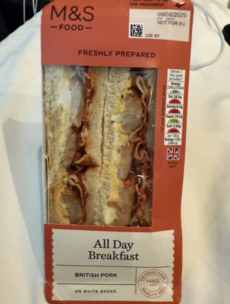 9時起床。このホテルは朝食が付いていないので、昨日買っておいたサンドウィッチで朝ごはん。マークス&スペンサーの「オール・デイ・ブレックファスト・サンドウィッチ」は「ポークソーセージ + ベーコン + タマゴサラダ」という日本ではあまりない組み合わせ。ソースが少し甘いが、今まで食べたことのない美味しさ。
