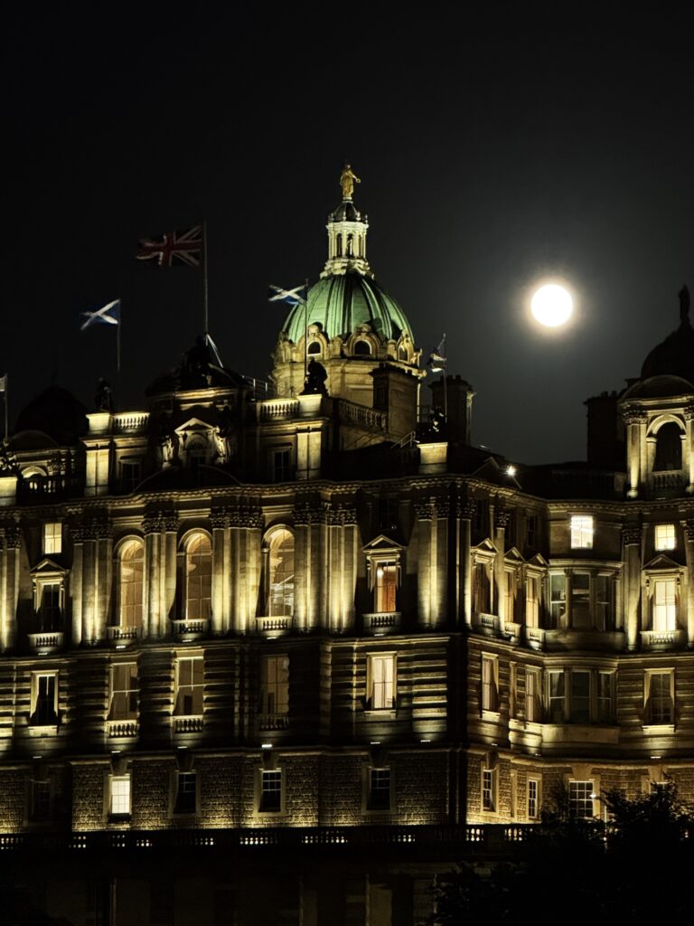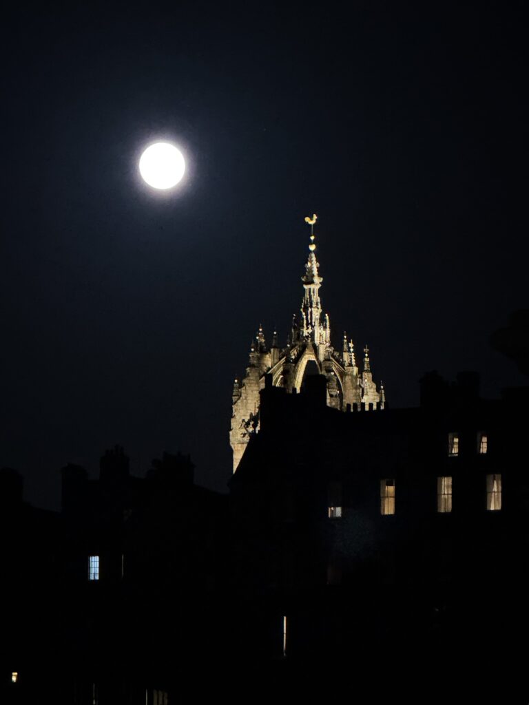 ホテルの近くまで戻ると、荘厳な建物群の横に煌々と照る満月が。体の芯まで冷えていたが、これにはしばし足を止めざるを得なかった。