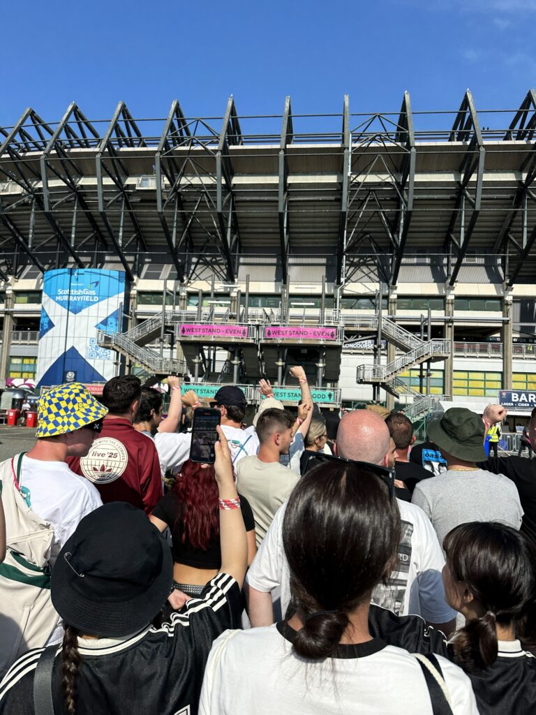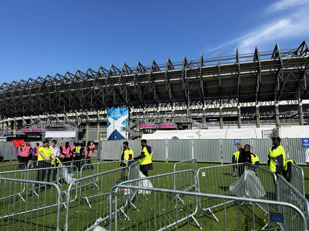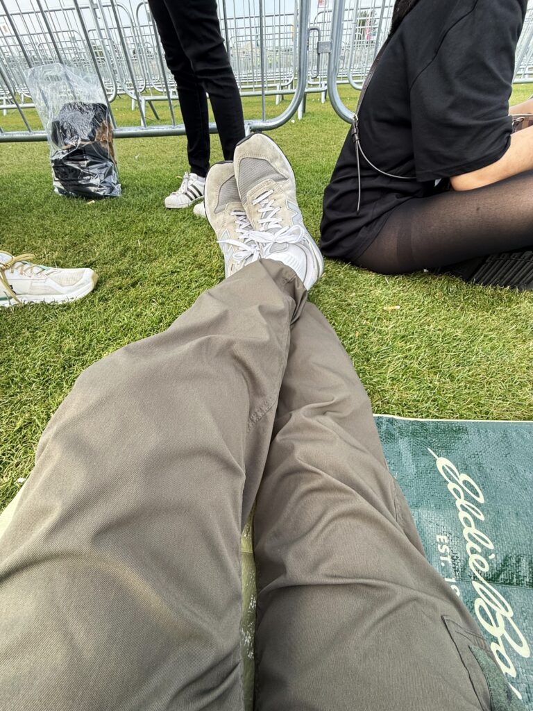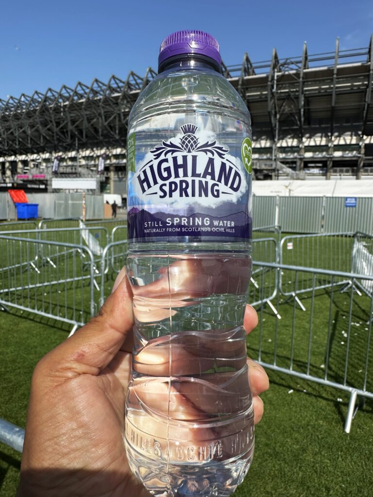 青空の下、芝生に座って17時の開場を待つ。気温は25℃とそれほど高くはないが、湿度が高く、座っているだけで汗が吹き出す。そのような中、会場のスタッフが希望者には日焼け止めを渡し、水(500mlペットボトル)まで配ってくれる。スコットランドのホスピタリティすごい!開場2時間前の時点で持参した2Lの水を飲み干してしまったので、水をもらえて本当に助かった。