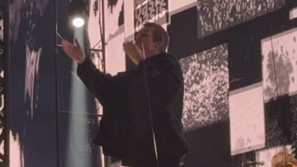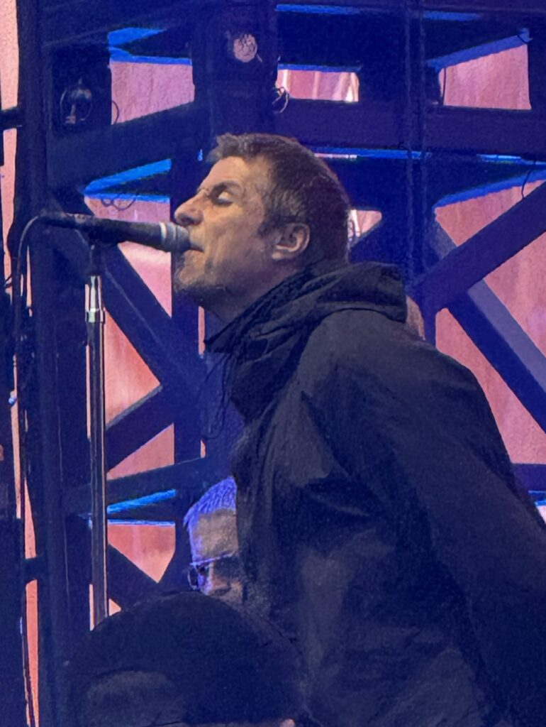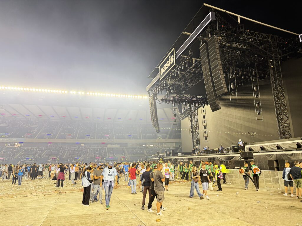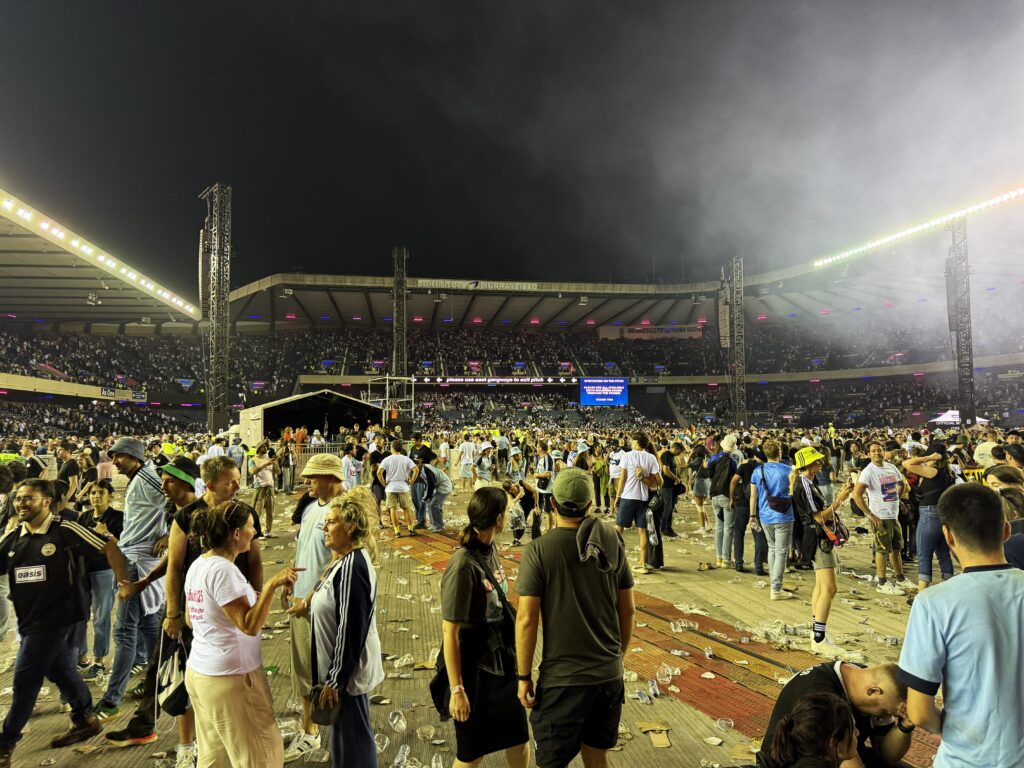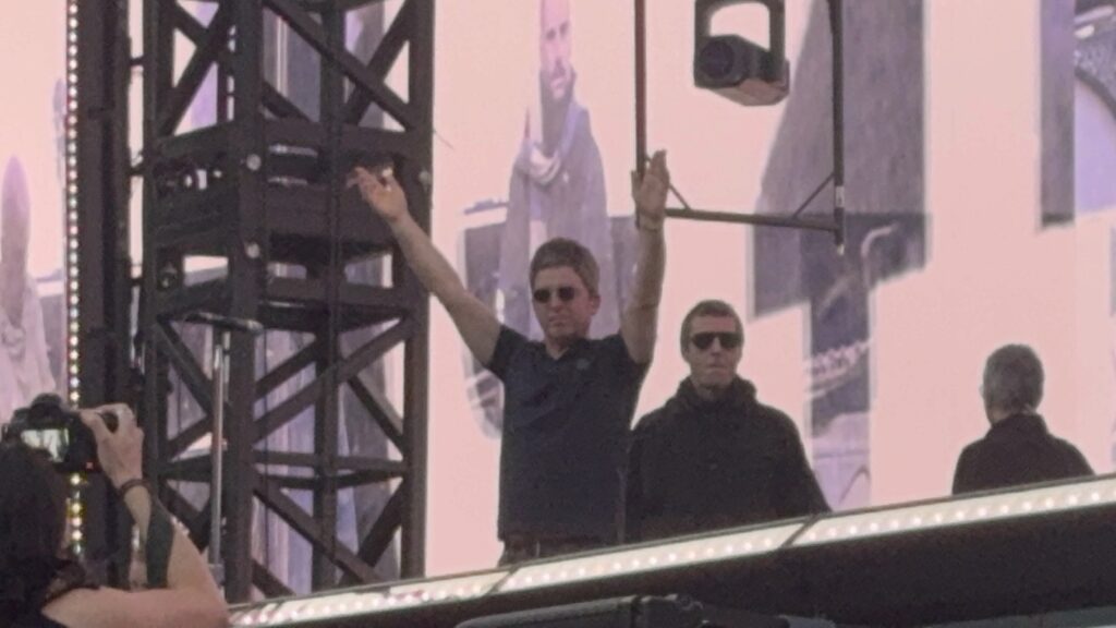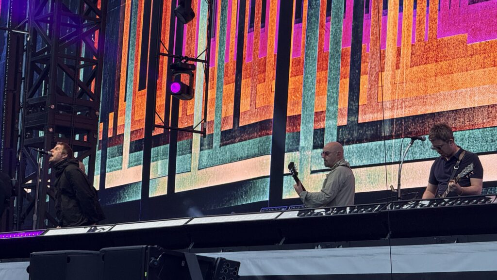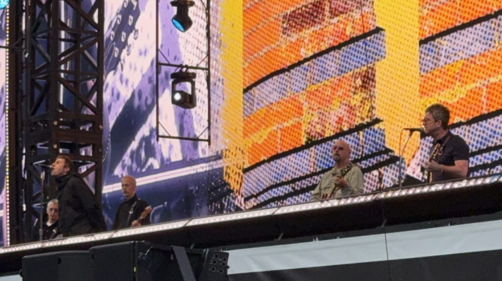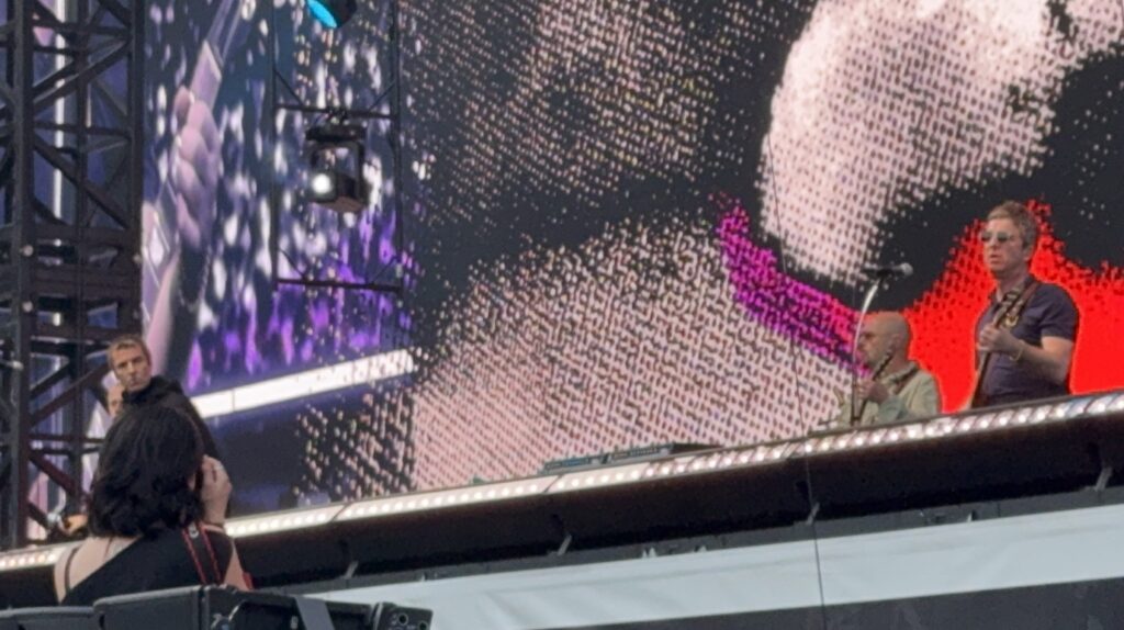 開演まで隣のシカゴから来た同世代の女性と話す。このツアーをカーディフからずっと追いかけているそうで、お互い酔狂な者同士で話が合った。オアシスの出番の前に最前列の夫婦2組のうち、旦那2人が酒を買いに行ったが、なかなか戻ってこない。奥さんは携帯で何やら話している。するとシカゴ女性が「男性2人は戻ってこないわよ」と教えてくれる。「わざわざ高いVIPチケットを買って最前列を確保したのにそんなことある?」と思ったけど、彼らは本当に戻ってこなかった。こんなに人が密集したところより、スペースに余裕があるところで酒を飲みながら観ることにしたようだ。これで少し視界が開けた。