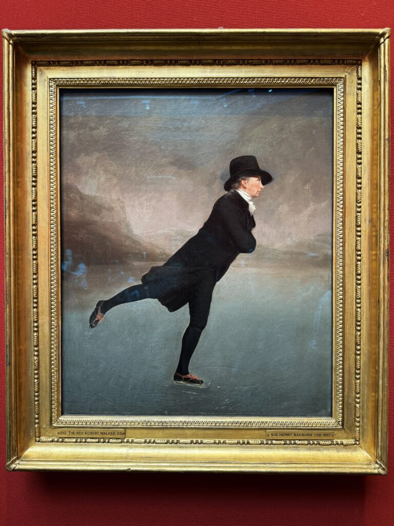 1点目は「ドゥッディングストン湖でスケートをするロバート・ウォルカー師」(作者はエディンバラ出身のヘンリー・レイバーンとされる)。第一印象は「ポップ」!1790年代の作品だが、現代の広告イラストとしても通用する大衆性を感じる。どこかユーモラスな牧師のスケート姿がリアルな筆致で描写されているのに対して、背景は淡い色彩と筆致で描かれており、そのコントラストを「ポップ」だと感じるのかもしれない。美術館の売店に行くと、この絵をモチーフにしたグッズが各種販売されていた。多くの大衆がこの絵に魅了されている証左だろう。