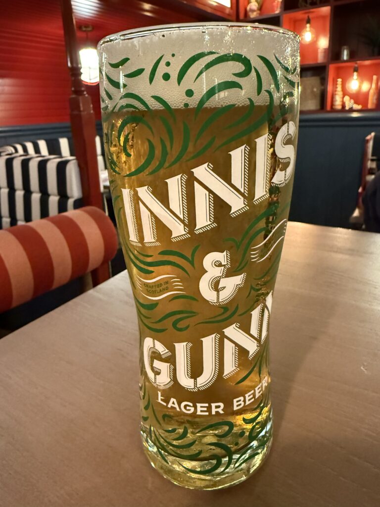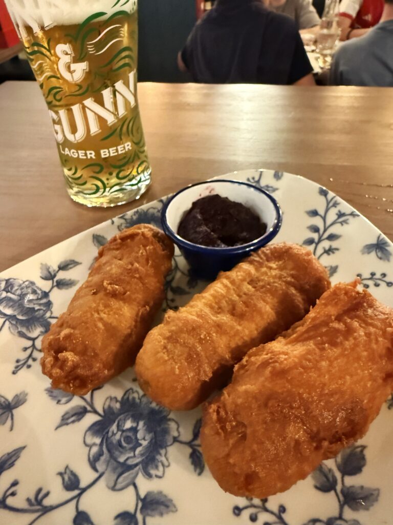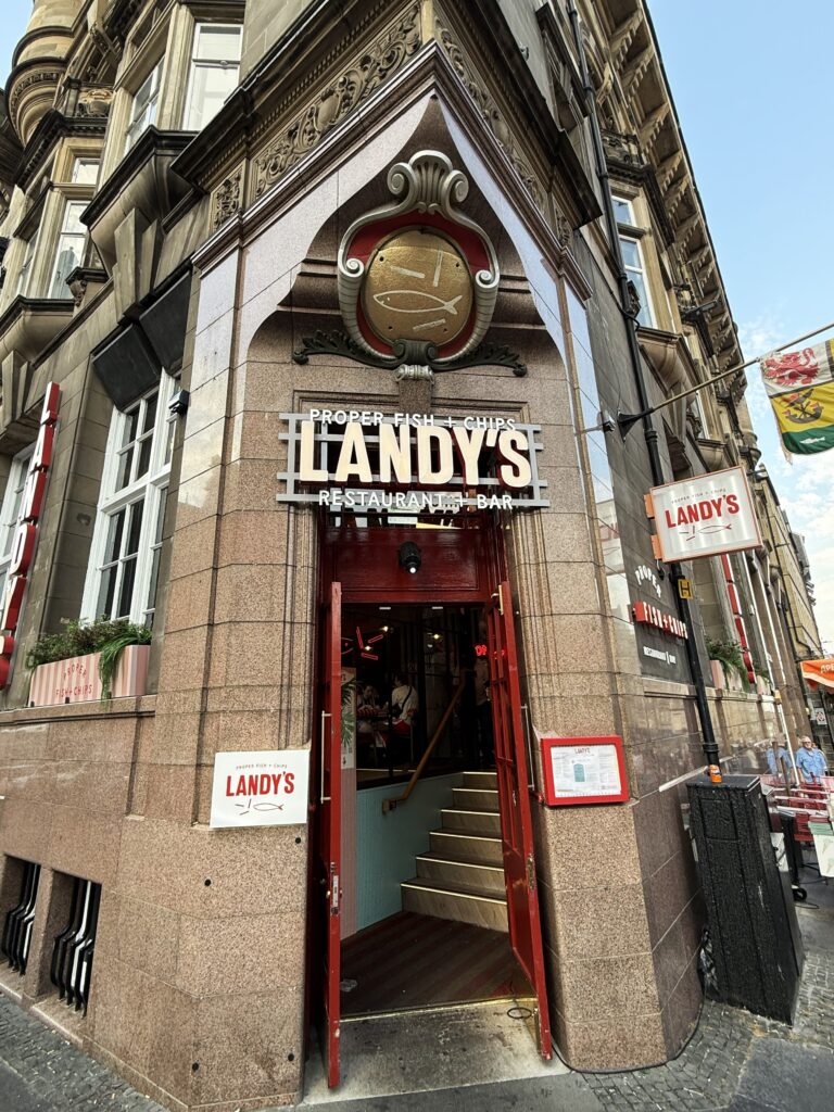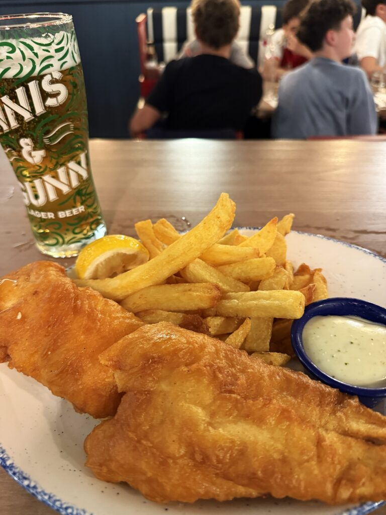 17時半に「ロイヤル・オーク」という有名なパブに行くが、満席で断念。すっかり外食モードだったので、通りがかったレストラン「ランディズ」に入った。ビールは「ここで一番ポピュラーなやつ」を注文。ポークソーセージは油で揚がっていて、プルーベリー?ソースをつけて食べる。フィッシュ&チップスには、バターこってりで酸味の効いたソースがよくあった。揚げ物ばかりで(まさかソーセージが揚がっているとは・・・)、ビールが進んでしまった。