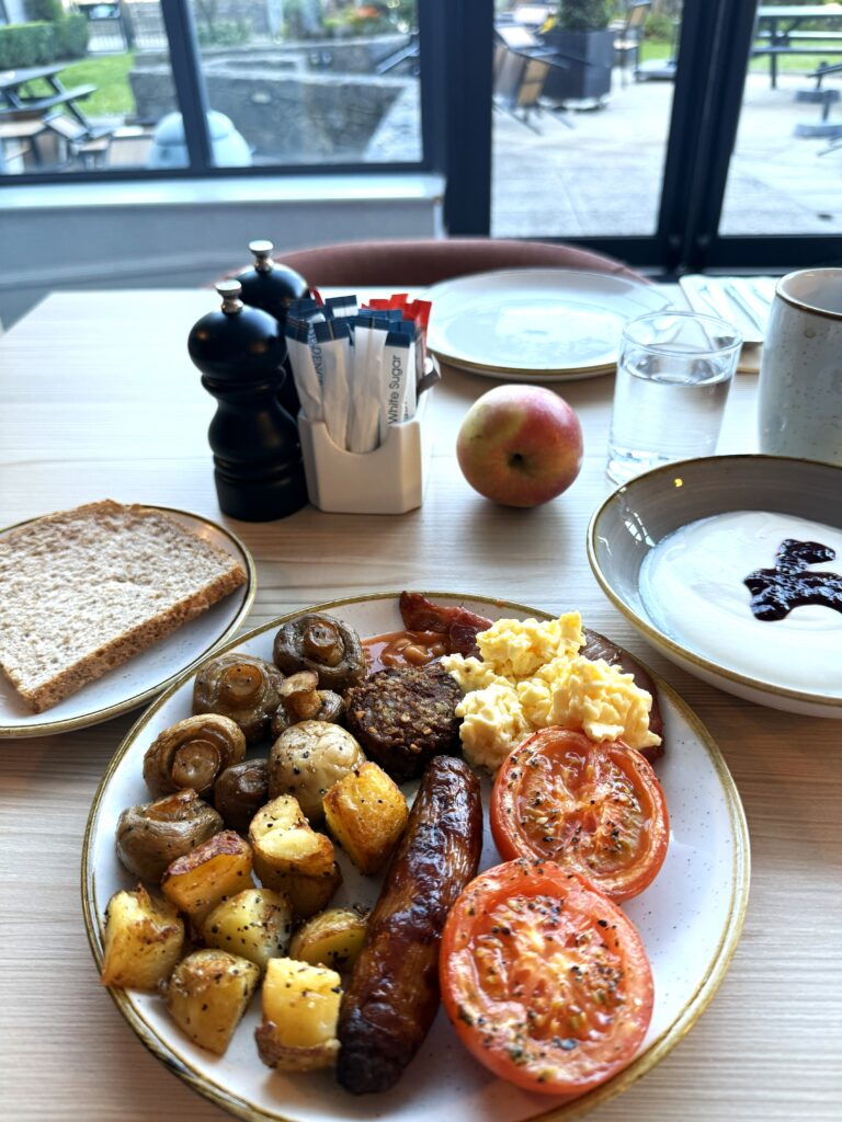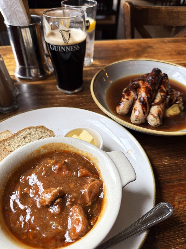ホテルにチェックインして、遅い昼食を取るために「クラウン・ダイニング・ルーム」へ。ベルファスト在住のアルお勧めのアイリッシュシチューと「ソーセージアンドチャンプ」、ギネス・ビールを注文。
