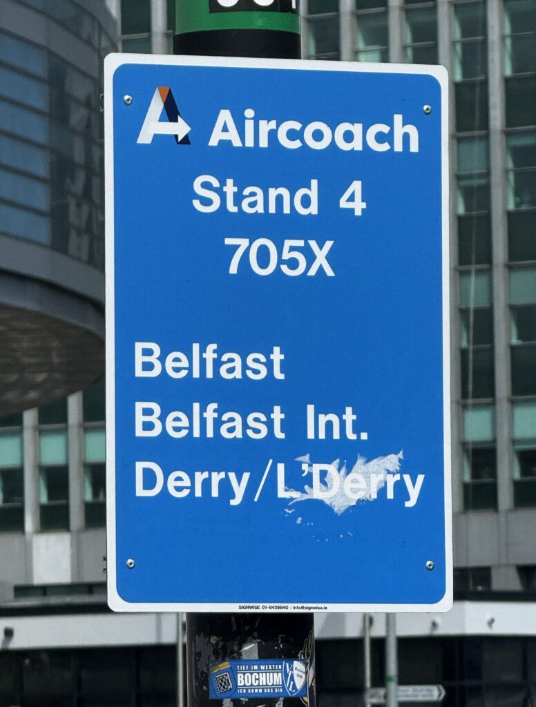 ダブリン空港のバス乗り場「ゾーン2」にはバス停が4つあり、最初は1番手前のバス停の行列に並んでしまった。よく見渡したら、「ゾーン2」の一番奥にベルファスト行きのスタンド4(ルート番号「705X」)の標識があった。無事バスを乗り換え、一安心。