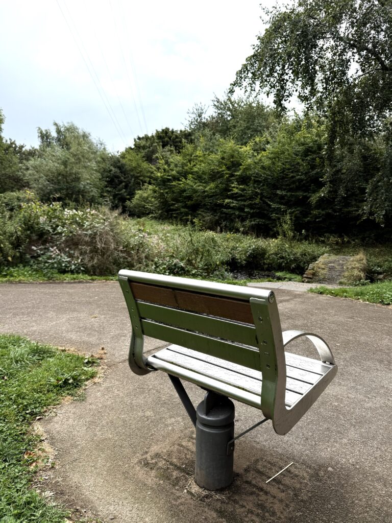 川の方を向く1人掛けのベンチ。スペースはあるのに、1人用のベンチとは不可解だ。アル曰く、ヴァンの歌詞を引用して「静寂を感じるため(to feel the silence)に敢えて1人掛けなんだ」。なるほど、これも気づかなかった。