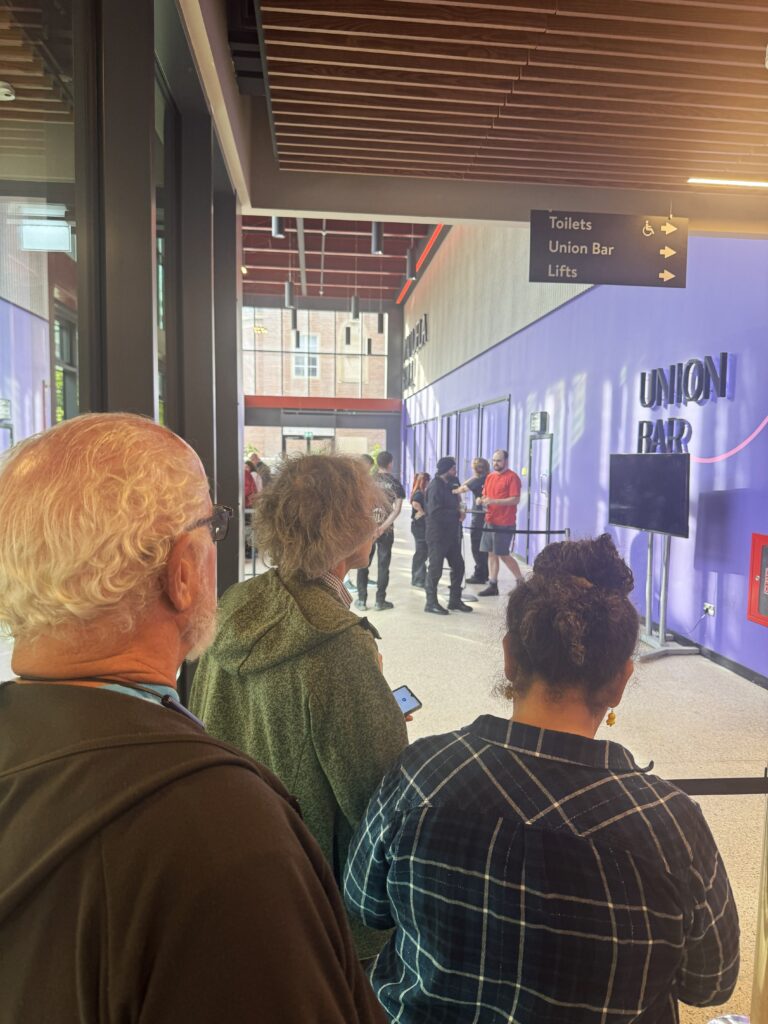 15時、開場の3時間半前に会場に着くと、既に5人が並んでいた。6番目ならいい席を取れるだろう。並んでいる間に、アイルランド人のブライアン(なんと東京在住!日本語は話せない)、ベルファスト近郊に住んでいる姉妹、アメリカ・ポートランドから来たシェーンとクリスティーンのカップルと知り合う。