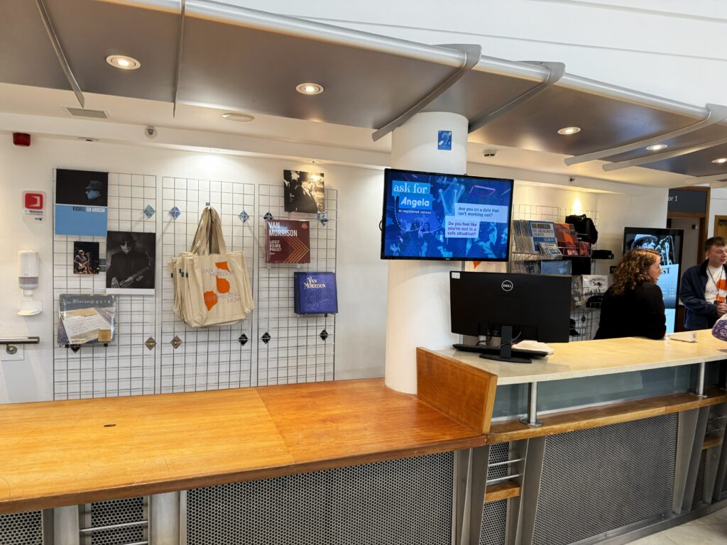 物販コーナーには、最近のアルバムなどが並んでいた。昨夜、ベルファスト出身でボストン在住のフランクから「最新作『Remembering Now』のサイン入りCDを売ってたら、買っておいてくれないか」と依頼があったのでサイン入りCDを購入。レジに進むと、僕の前に会計していたのは以前から知り合いのFさんだった。今年2月にライブ会場で知り合ったベルファスト在住のデイヴィッドとも再会し、しばし歓談。