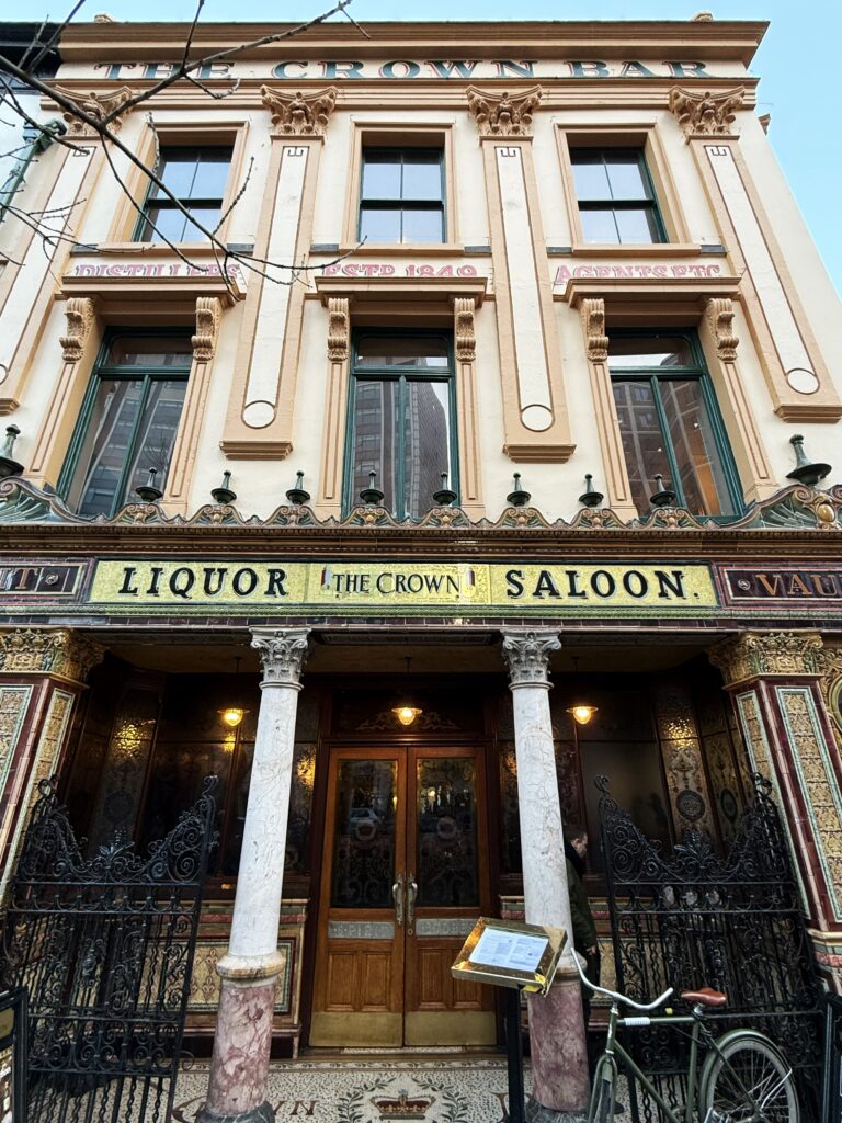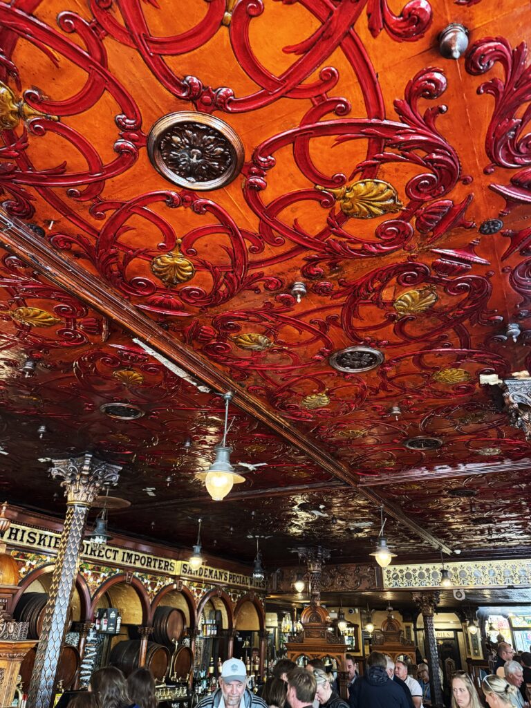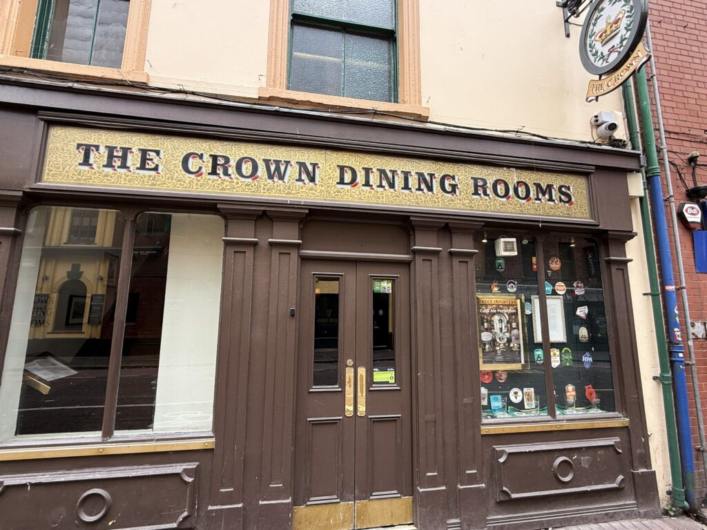 1826年に開店した「クラウン・リカー・サロン」は北アイルランドを代表するパブの一つ。その博物館のような内装の中でもとりわけ美しいステンドグラスや木製の装飾、タイル張りはイタリア人職人の手によるものだという。夏期は観光客で混み合っているが、内装を見に行くだけでも価値があるパブだ。
