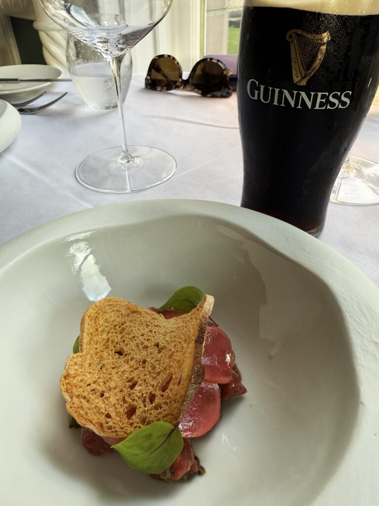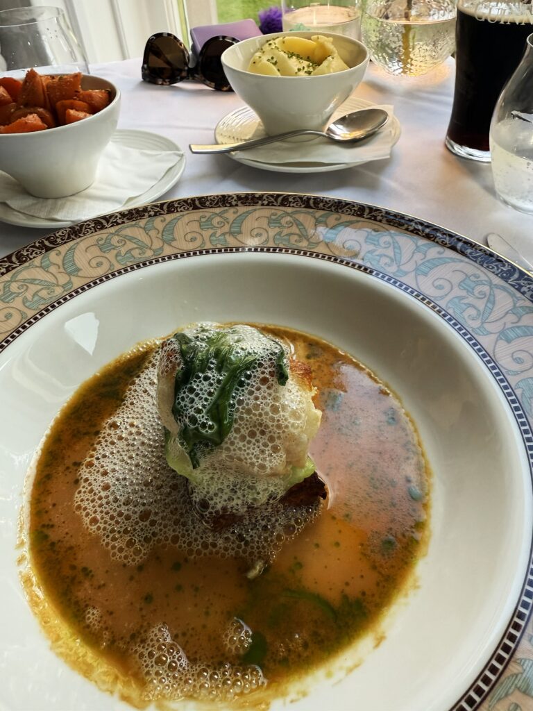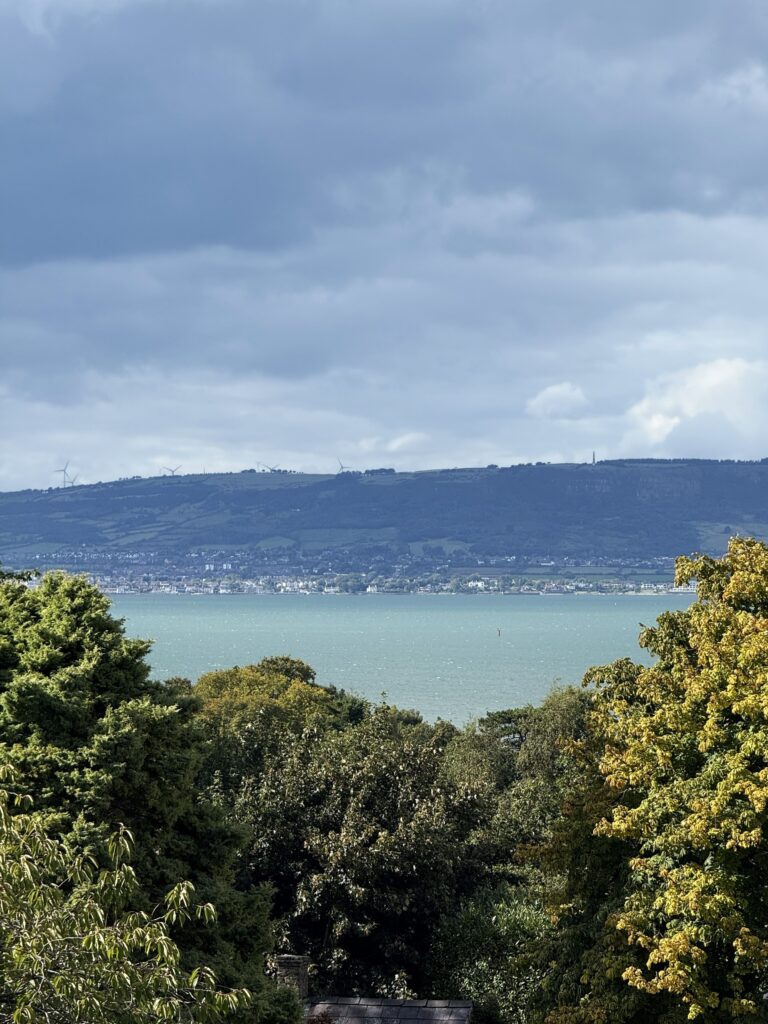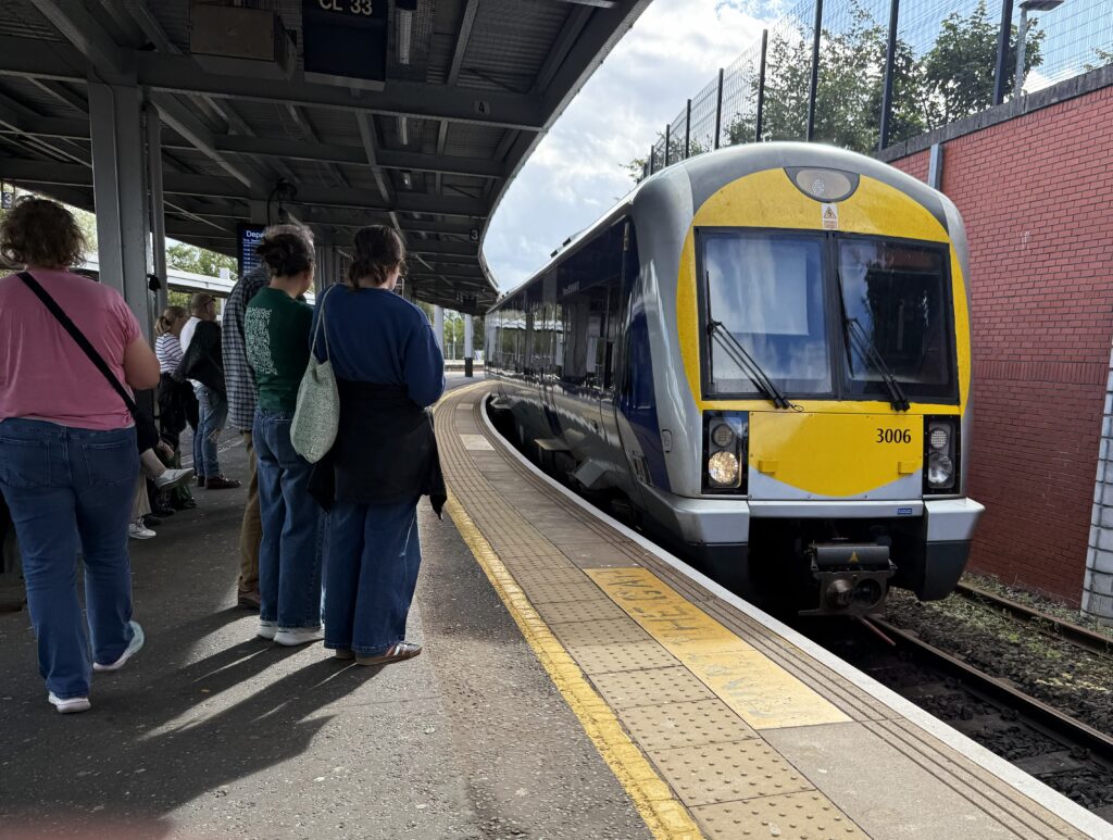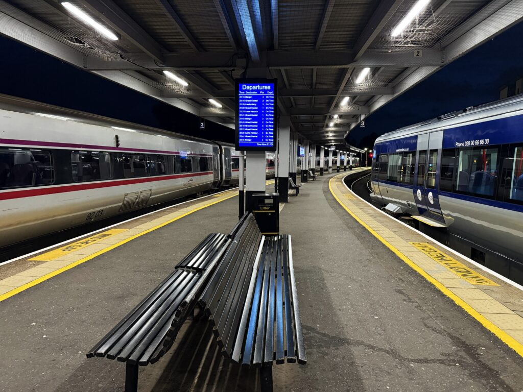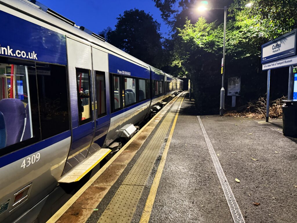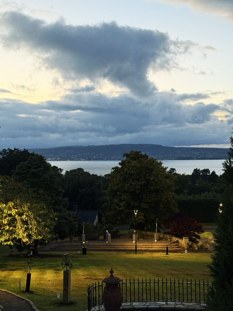 ディナーは彼女が滞在するホテルのレストランで取ることになった。ベルファスト中心地からホテル最寄りの駅までは電車で約30分弱。電車は海岸沿いを進み、ちょっとした小旅行気分だ。