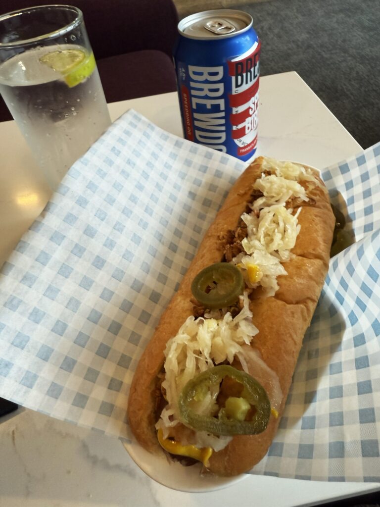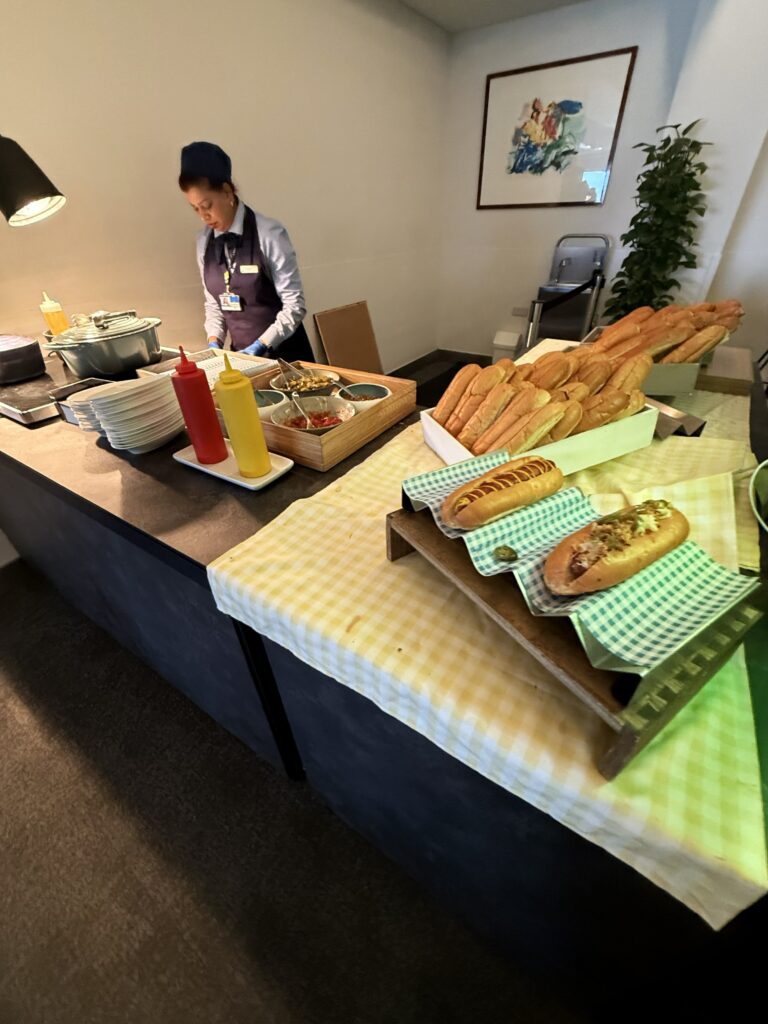 ヒースロー空港のブリティッシュ・エアウェイズのラウンジに入ると、ホットドッグのサービスカウンターができていた。その場でパンとソーセージを温め、トッピングして味付けしてくれる。作りたての料理は美味しくて、プレーンとピリ辛、2つも食べてしまった。
