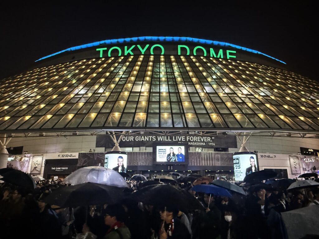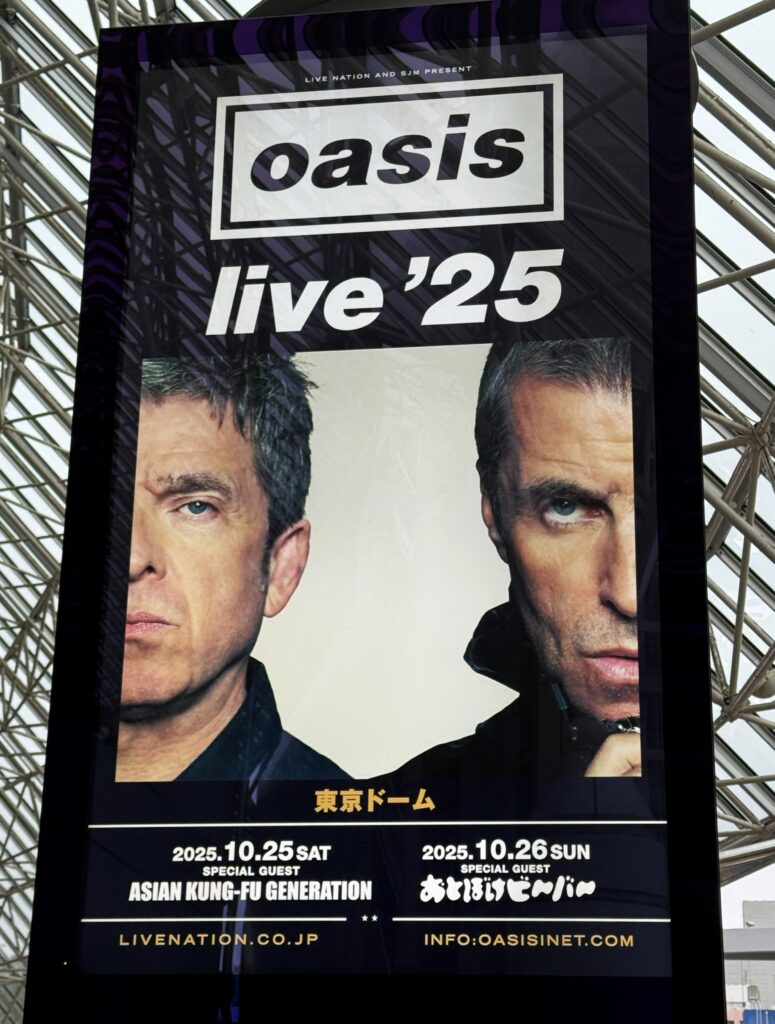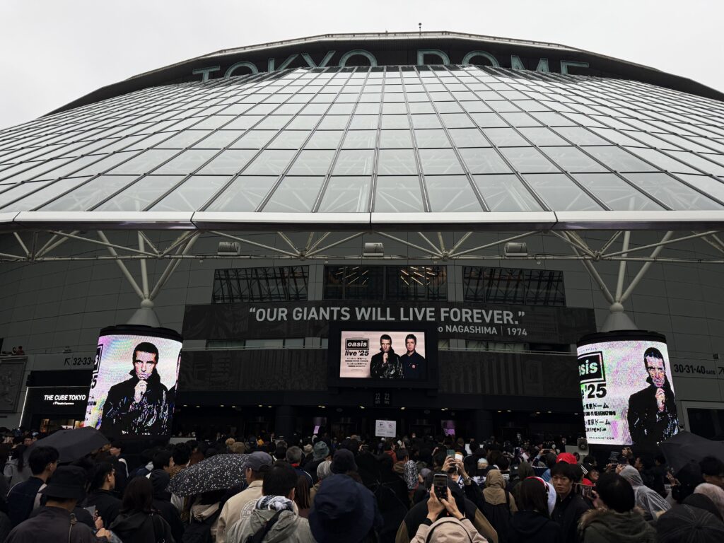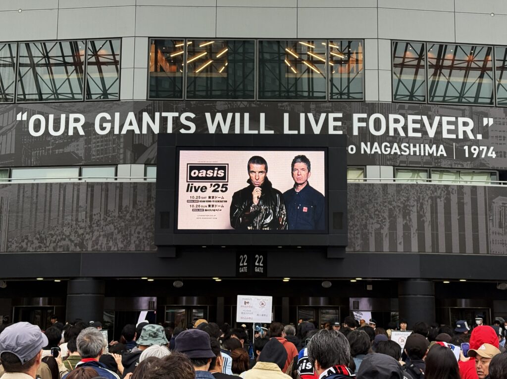 15時過ぎに雨の水道橋に着き、東京ドームへ。ドームの正面玄関(ゲート22)には、ギャラガー兄弟の写真の上に、長嶋茂雄終身名誉監督の”Our Giants Will Live Forever(わが巨人軍は永久に不滅です)”という言葉が刻まれている。わざわざ英語にしているので(ちょっと訳も不自然だし)、「オアシスの曲名”Live Forever”にかけて今回のライブのために設置したんだろう、なかなか洒落たことをするな」と思っていたら、この言葉が設置されたのは2022年だった。なんと、これは単なる偶然の奇跡!