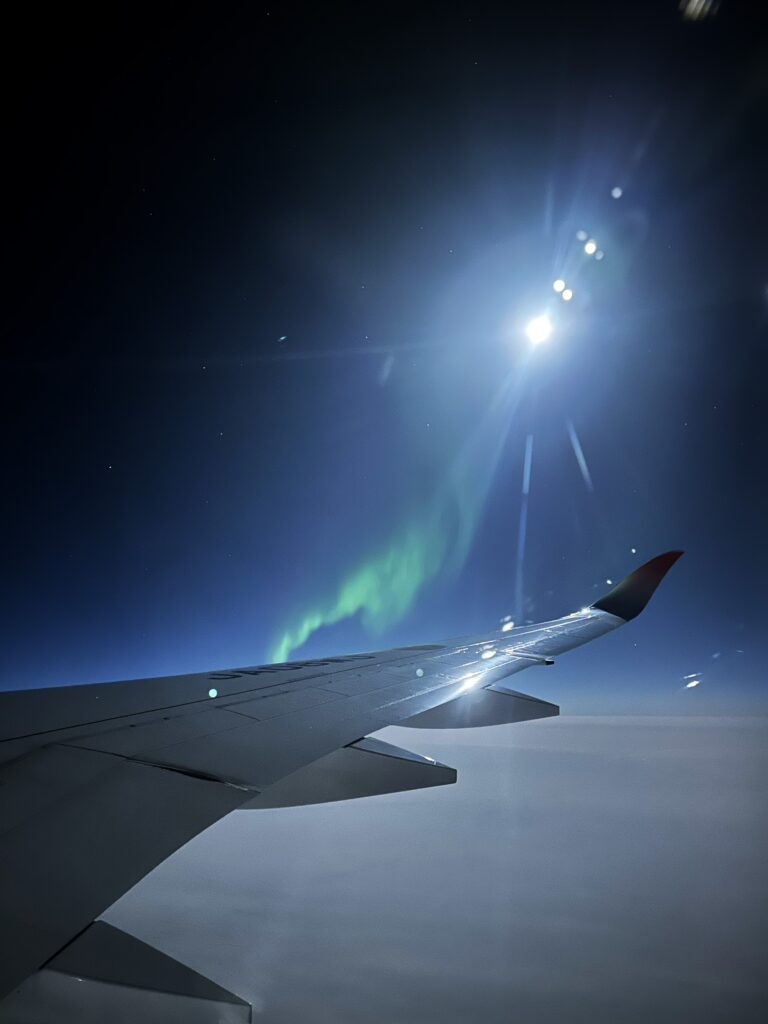 2022年2月のロシアによるウクライナ軍事侵攻以降、羽田発の欧州線はロシア上空を避けて、アラスカや北極上空を経由する北回りルートを取るようになった。その結果、14時間半の超ロングフライトとなってしまったわけだが(従来からプラス2~3時間)、一つだけいいことがあった。12月から3月にかけて機内からオーロラが見えることがあるのだ。機内からはじめてオーロラを見たのは、コロナ禍が終息に近づいた2023年3月にロンドンに向かった時のこと。消灯された機内で映画を観ていると、機長から「左手にオーロラが見えます」とアナウンスがあり、びっくりして窓の外を見てみると、緑色のオーロラが見えた!まさかロンドン行きの機上でオーロラが見えるとは思ってもみなかったので、驚いた。フライトマップを確認すると、オーロラが見えたのは北極海上。