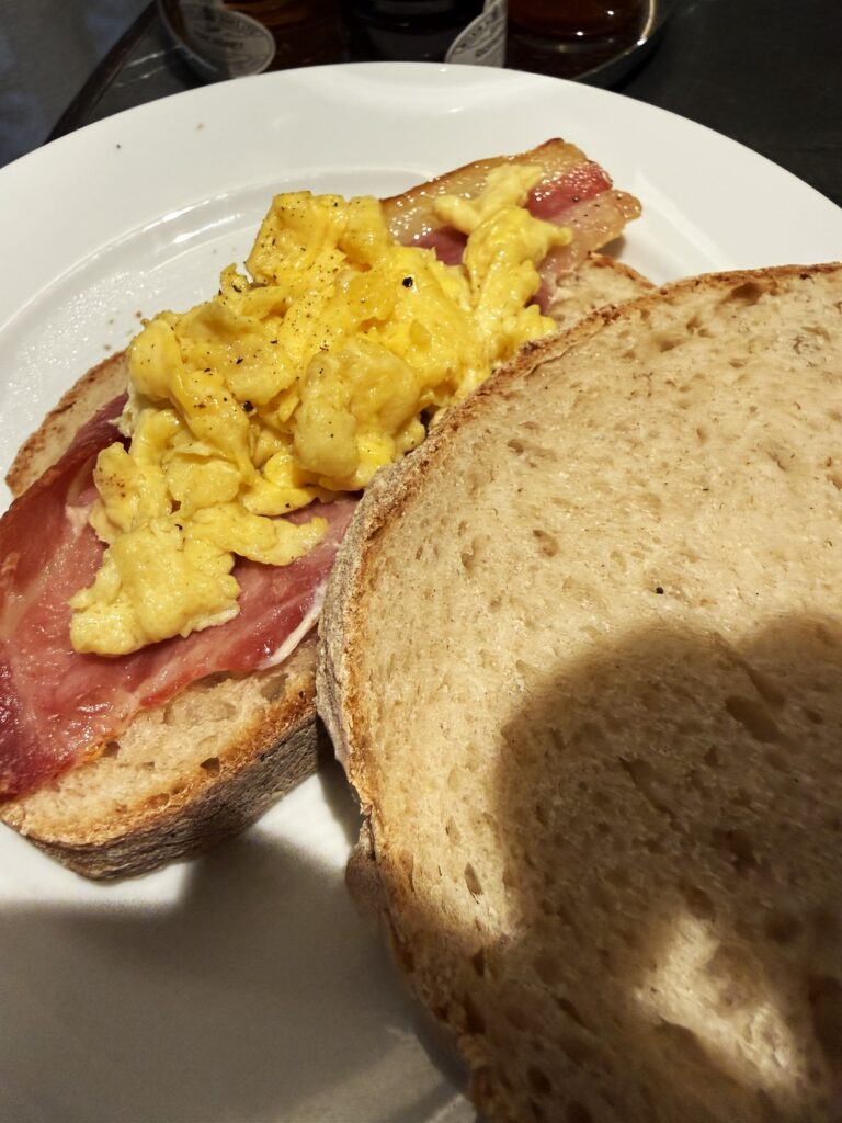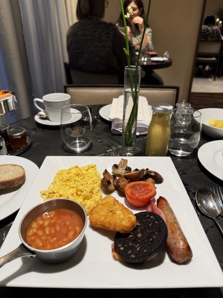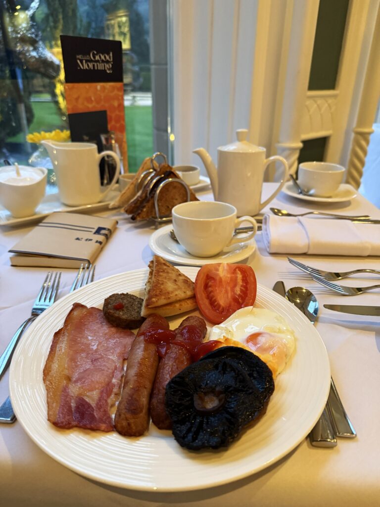 ビュッフェ形式のアイリッシュ・ブレックファストを選ぶと、「トーストは召し上がりますか?」と訊かれたので、コーヒーと一緒にお願いする。しばらくすると、トーストラック(トーストスタンドともいう)に乗った小ぶりな白と全粒粉のトースト4切れがサーブされた。ここ北アイルランドの朝食は「アルスター・フライ(Ulster Fly)」と呼ばれ、「ポテトブレッド(余り物のマッシュポテトに牛乳やバターを加えて作り直したのが始まり)」や「ソーダブレッド(ブラウン・ブレッド同様に発酵させないパンで、代わりにクッキング・ソーダを入れる)」が定番。トーストにバターをたっぷり塗って食べたら美味しかった。あと、バターで炒めた大きな椎茸!素材そのものの美味しさを堪能。